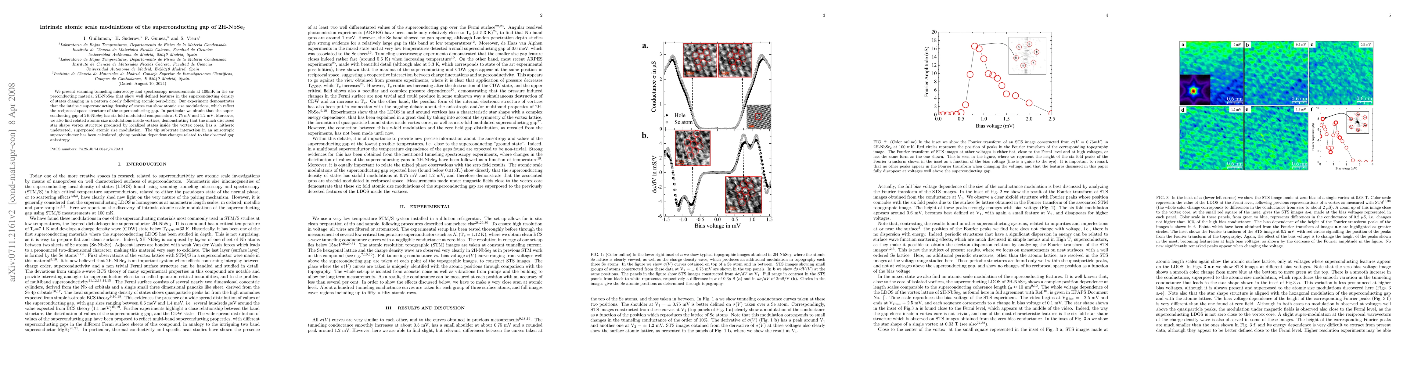 This study reveals atomic scale modulations in the superconducting gap of 2H-NbSe2 using scanning tunneling microscopy, showing a six-fold pattern in the gap components at 0.75 mV and 1.2 mV. The research also uncovers atomic size modulations in vortex cores, indicating a previously undetected superposed atomic structure.