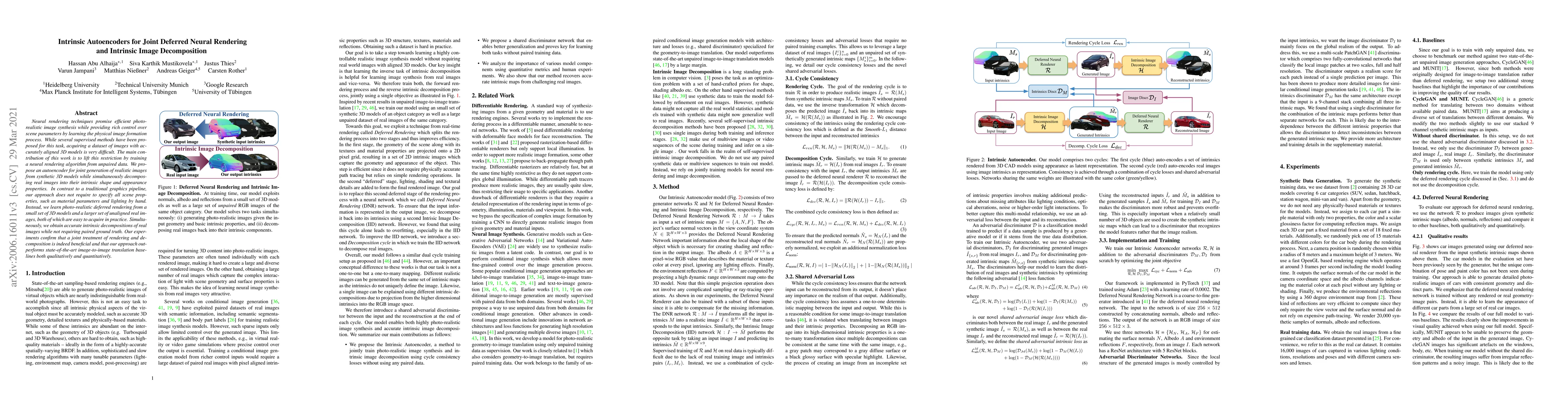 This paper proposes an autoencoder for neural rendering that generates realistic images from synthetic 3D models and decomposes real images into intrinsic properties without paired ground truth. The method leverages unpaired data, outperforming existing image-to-image translation techniques in both qualitative and quantitative assessments.