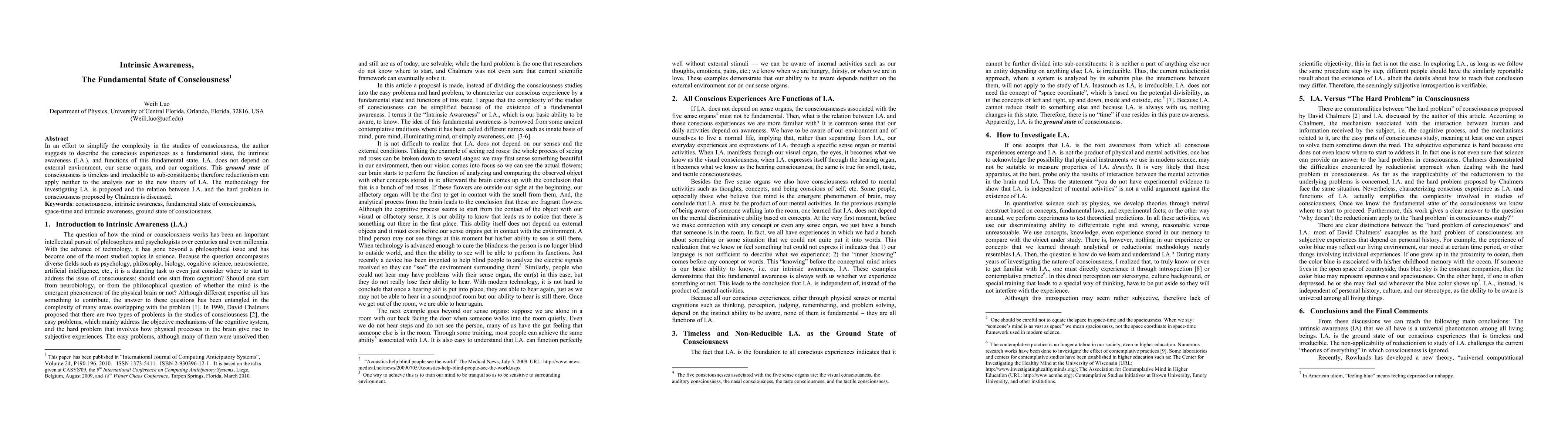 The paper proposes intrinsic awareness (IA) as a fundamental, timeless state of consciousness independent of external stimuli and cognition, arguing against reductionism. It also discusses the methodology for studying IA and its relation to the "hard problem" of consciousness.