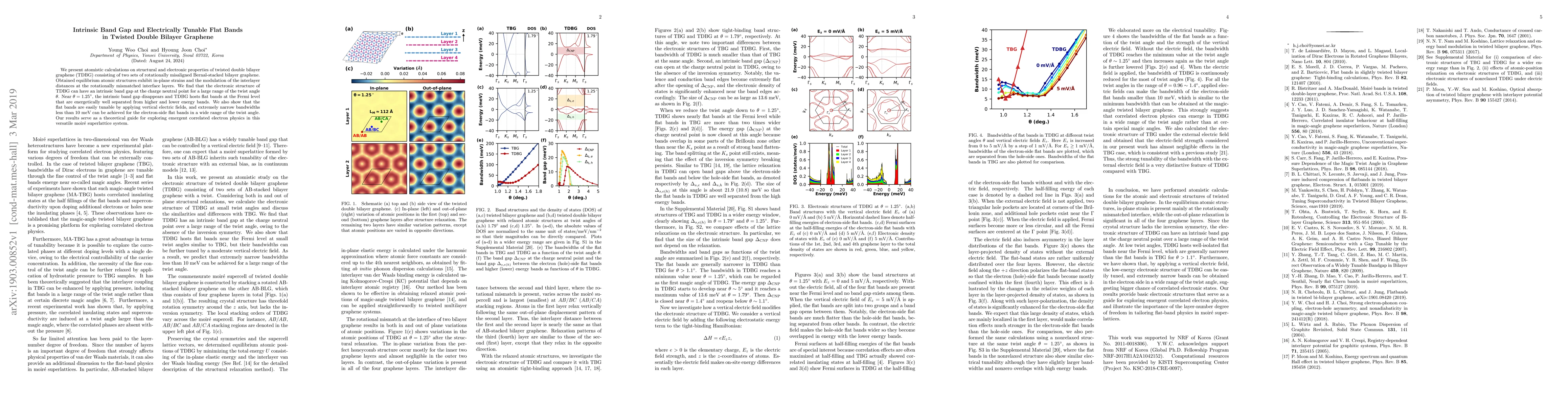 This paper explores the electronic properties of twisted double bilayer graphene (TDBG), revealing an intrinsic band gap at the charge neutral point for various twist angles. Near a twist angle of 1.25 degrees, TDBG exhibits electrically tunable flat bands at the Fermi level, with potential for extremely narrow bandwidths, suggesting its applicability in correlated electron physics studies.
