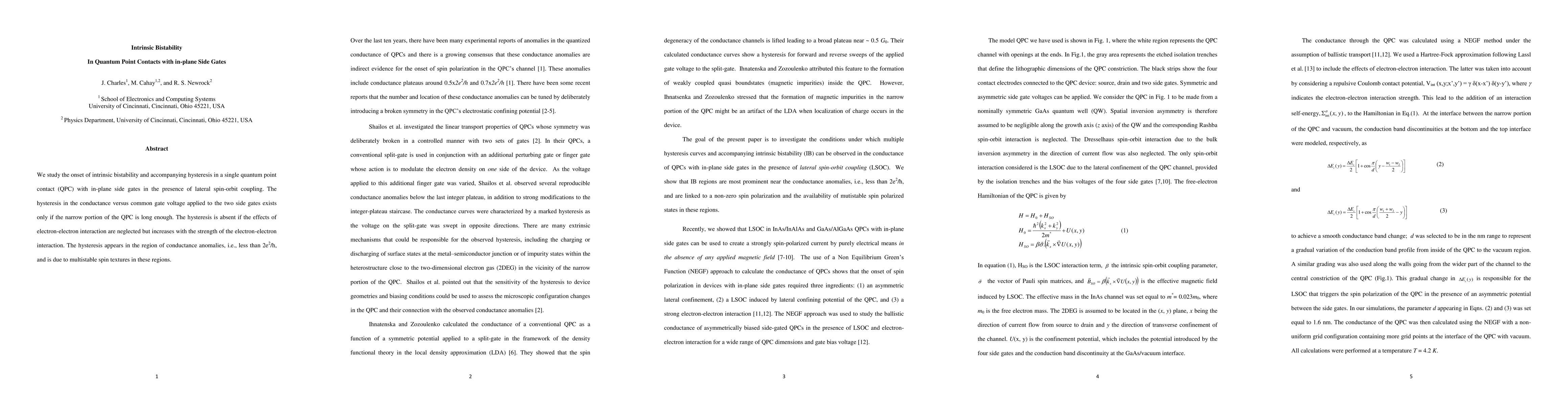 We study the onset of intrinsic bistability and accompanying hysteresis in a single quantum point contact (QPC) with in-plane side gates in the presence of lateral spin-orbit coupling. The hysteresis in the conductance versus common gate voltage applied to the two side gates exists only if the narrow portion of the QPC is long enough. The hysteresis is absent if the effects of electron-electron interaction are neglected but increases with the strength of the electron-electron interaction. The hysteresis appears in the region of conductance anomalies, i.e., less than 2e2/h, and is due to multistable spin textures in these regions.