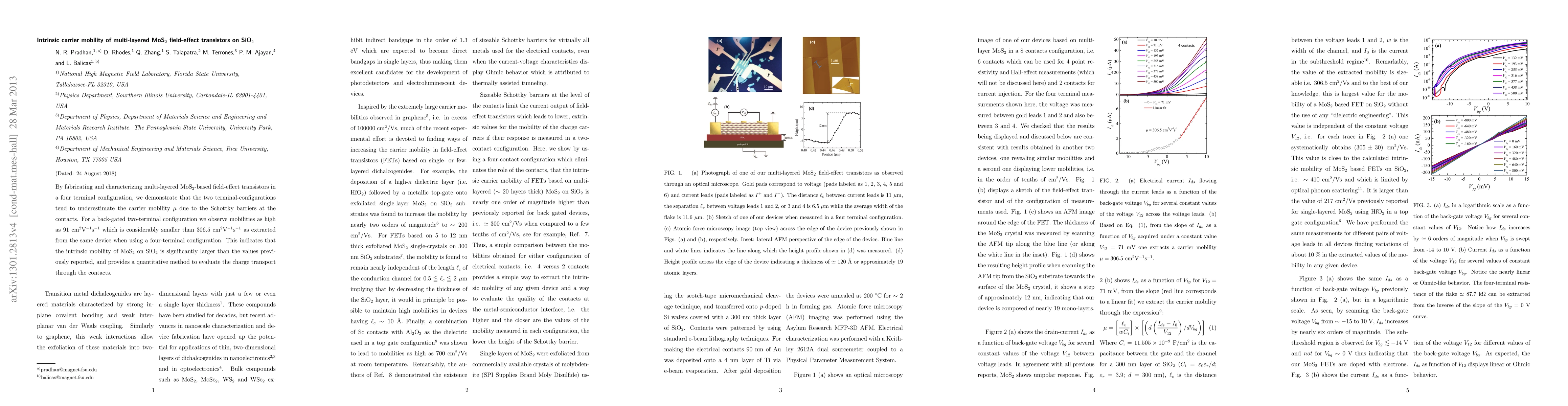 By fabricating and characterizing multi-layered MoS$_2$-based field-effect transistors (FETs) in a four terminal configuration, we demonstrate that the two terminal-configurations tend to underestimate the carrier mobility $\mu$ due to the Schottky barriers at the contacts. For a back-gated two-terminal configuration we observe mobilities as high as 125 cm$^2$V$^{-1}$s$^{-1}$ which is considerably smaller than 306.5 cm$^2$V$^{-1}$s$^{-1}$ as extracted from the same device when using a four-terminal configuration. This indicates that the intrinsic mobility of MoS$_2$ on SiO$_2$ is significantly larger than the values previously reported, and provides a quantitative method to evaluate the charge transport through the contacts.