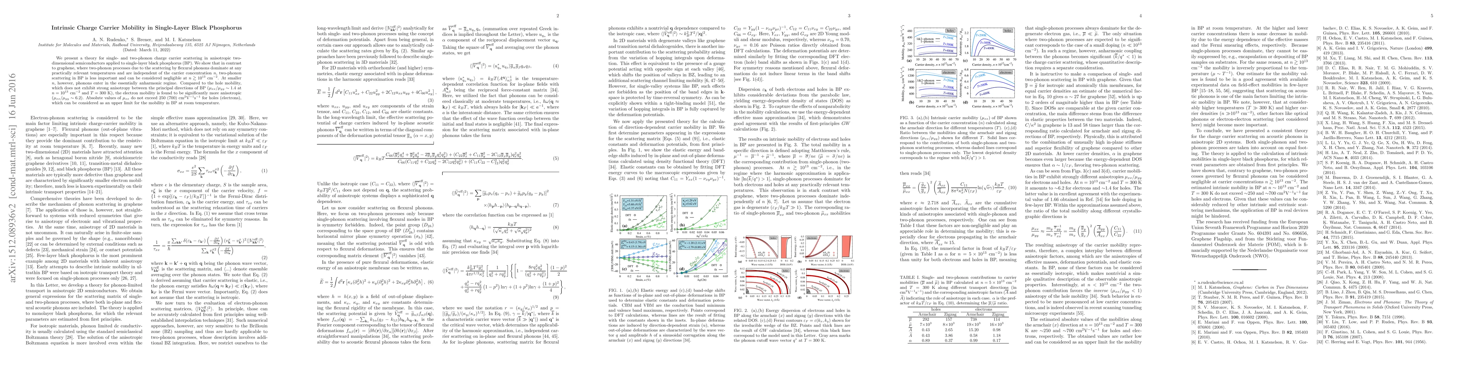 This research provides a theoretical analysis of charge carrier scattering mechanisms in single-layer black phosphorus, highlighting that two-phonon scattering is negligible at high carrier concentrations unlike in graphene. It reveals significant anisotropy in electron mobility compared to hole mobility, with the latter showing values up to 250 cm²V⁻¹s⁻¹ and the former reaching up to 700 cm²V⁻¹s⁻¹ at room temperature.