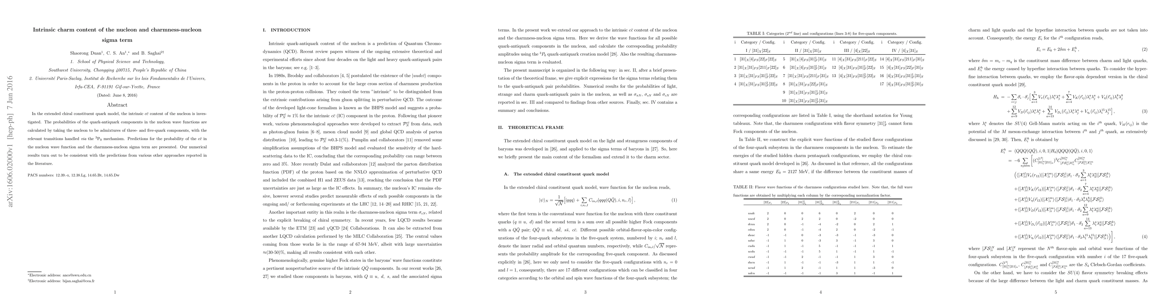 This paper investigates the intrinsic charm content within nucleons using the extended chiral constituent quark model, predicting the probability of charm-anticharm pairs and the charmness-nucleon sigma term, consistent with other theoretical approaches.