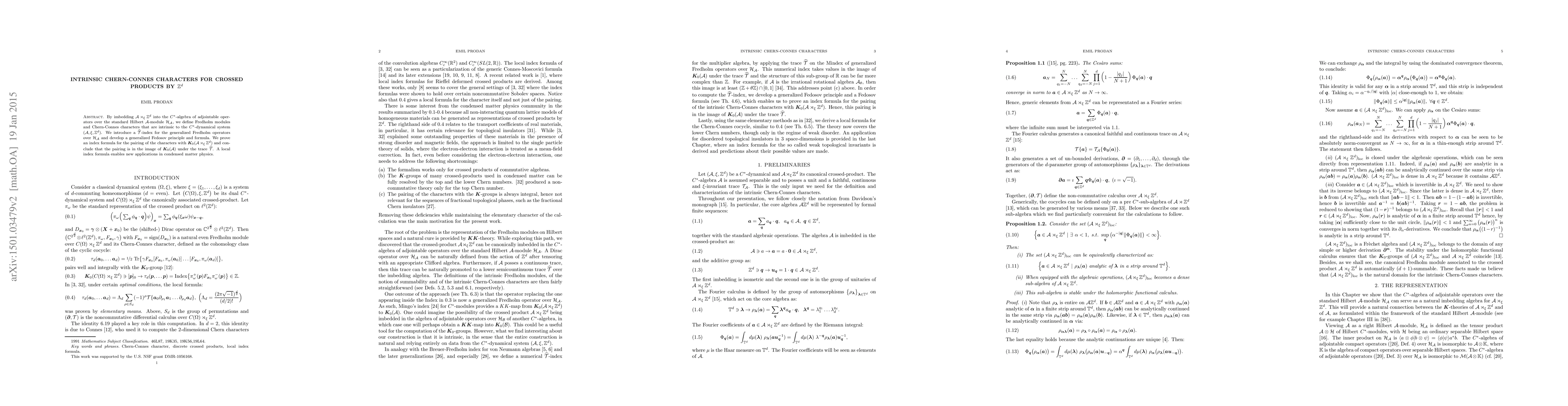 We present a natural imbedding of the crossed product $\mathcal A \rtimes_\xi \mathbb Z^d$ into the $C^\ast$-algebra of adjointable operators over the standard Hilbert $\mathcal A$-module $\mathcal H_{\mathcal A}$. By replacing the representations on Hilbert spaces with this canonical imbedding, we define Fredholm modules and corresponding Chern-Connes characters that are intrinsic to the $C^\ast$-dynamical system $(\mathcal A,\xi,\mathbb Z^d)$. The compression of the Dirac operator against projectors from $\mathcal A \rtimes_\xi \mathbb Z^d$ produces generalized Fredholm operators over $\mathcal H_{\mathcal A}$ and Mingo's index defines a $KK$-map from $K_0(\mathcal A \rtimes_\xi \mathbb Z^d)$ to $K(\mathcal A)$. Using a generalized Fedosov principle and a generalized Fedosov formula, we prove an index formula for the pairing of the intrinsic Chern-Connes characters and $K_0(\mathcal A \rtimes_\xi \mathbb Z^d)$. This pairing takes values in the image of $K_0(\mathcal A)$ in $\mathbb R$ under a canonical trace. A local index formula enables new applications in condensed matter physics to the so called weak topological invariants.