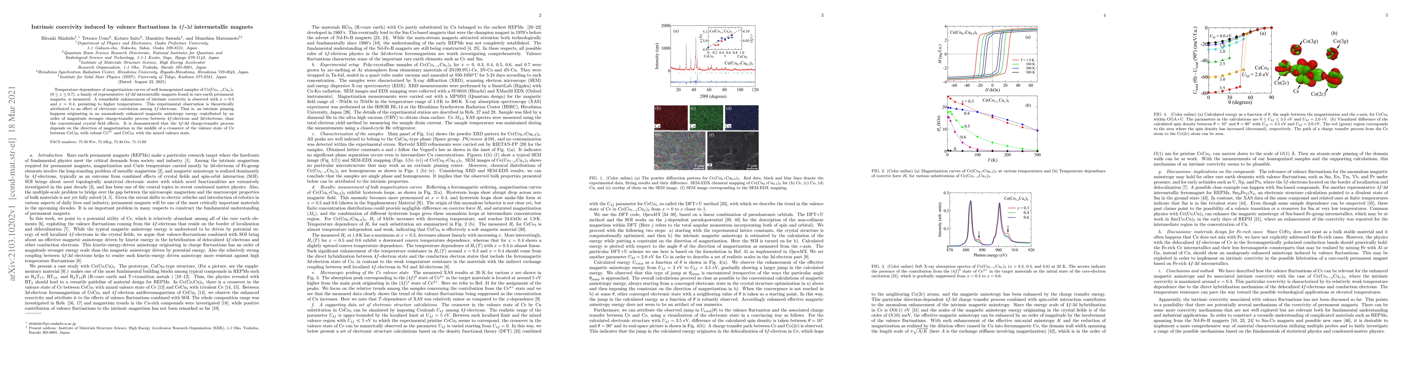 Temperature dependence of magnetization curves of well homogenized samples of Ce(Co$_{1-x}$Cu$_{x}$)$_5$ ($0\le x \le 0.7$), a family of representative $4f$-$3d$ intermetallic magnets found in rare-earth permanent magnets, is measured. A remarkable enhancement of intrinsic coercivity is observed with $x=0.3$ and $x=0.4$, persisting to higher temperatures. This experimental observation is theoretically attributed to an effect of electronic correlation among $4f$-electrons. That is, an intrinsic pinning happens originating in an anomalously enhanced magnetic anisotropy energy contributed by an order of magnitude stronger charge-transfer process between $4f$-electrons and $3d$-electrons, than the conventional crystal field effects. It is demonstrated that the $4f$-$3d$ charge-transfer process depends on the direction of magnetization in the middle of a crossover of the valence state of Ce between CeCu$_5$ with robust Ce$^{3+}$ and CeCo$_5$ with the mixed valence state.
