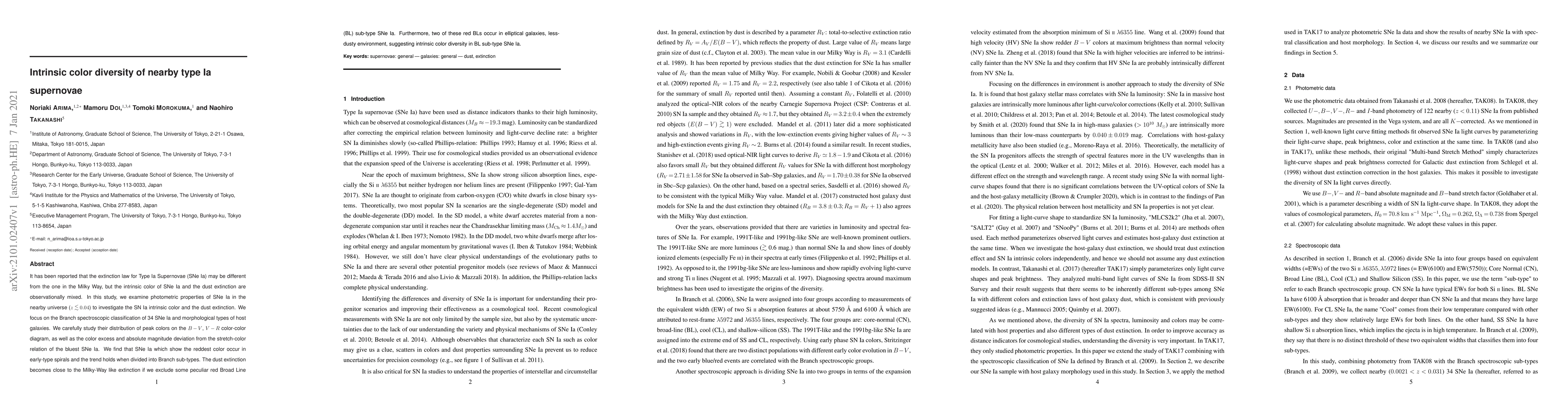 It has been reported that the extinction law for Type Ia Supernovae (SNe Ia) may be different from the one in the Milky Way, but the intrinsic color of SNe Ia and the dust extinction are observationally mixed. In this study, we examine photometric properties of SNe Ia in the nearby universe ($z \lesssim 0.04$) to investigate the SN Ia intrinsic color and the dust extinction. We focus on the Branch spectroscopic classification of 34 SNe Ia and morphological types of host galaxies. We carefully study their distribution of peak colors on the $B-V$, $V-R$ color-color diagram, as well as the color excess and absolute magnitude deviation from the stretch-color relation of the bluest SNe Ia. We find that SNe Ia which show the reddest color occur in early-type spirals and the trend holds when divided into Branch sub-types. The dust extinction becomes close to the Milky-Way like extinction if we exclude some peculiar red Broad Line (BL) sub-type SNe Ia. Furthermore, two of these red BLs occur in elliptical galaxies, less-dusty environment, suggesting intrinsic color diversity in BL sub-type SNe Ia.