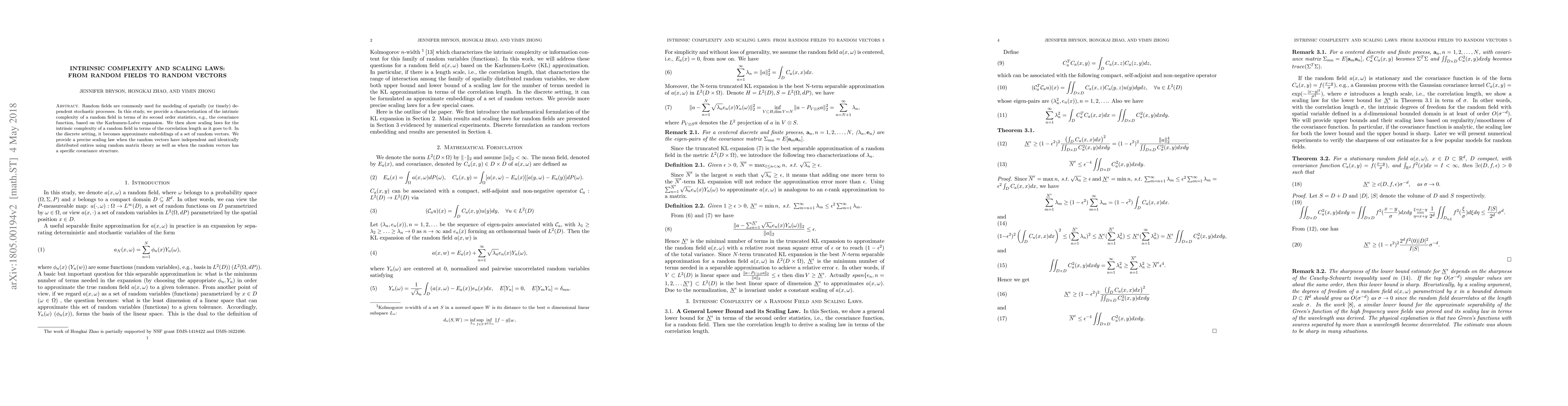 This study characterizes the intrinsic complexity of random fields using second-order statistics, revealing scaling laws that relate to correlation length. It provides precise scaling laws for specific covariance structures and independent random vectors.