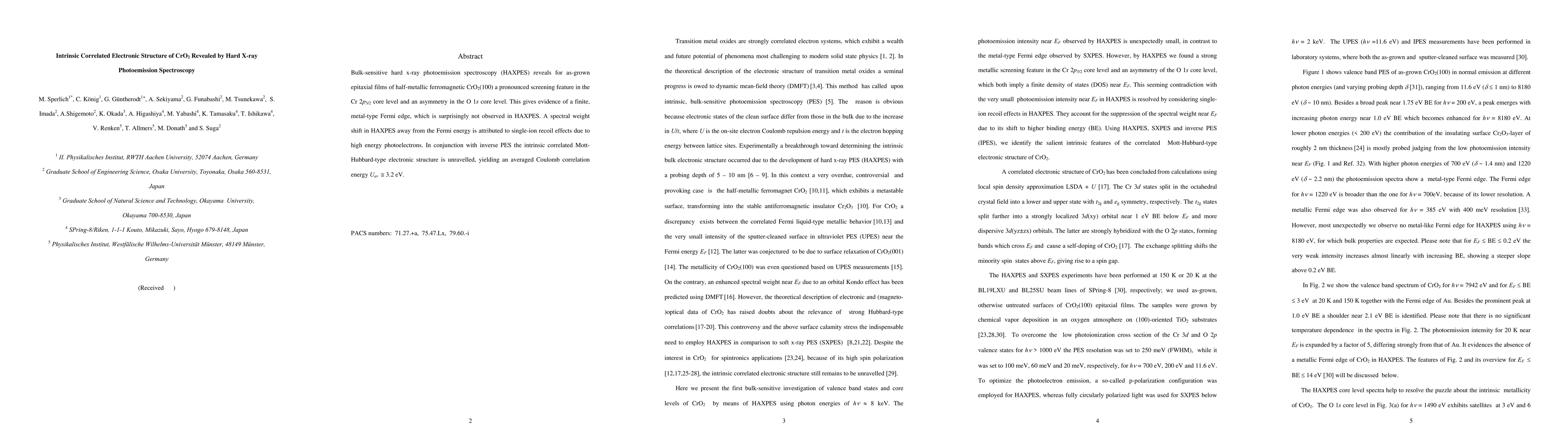 Summary: Hard X-ray photoemission spectroscopy reveals a pronounced screening feature in CrO2, indicating a metal-type Fermi edge and a spectral weight shift due to single-ion recoil effects. Combined with inverse PES, it uncovers an intrinsic correlated electronic structure with a Coulomb correlation energy of ~3.2 eV.