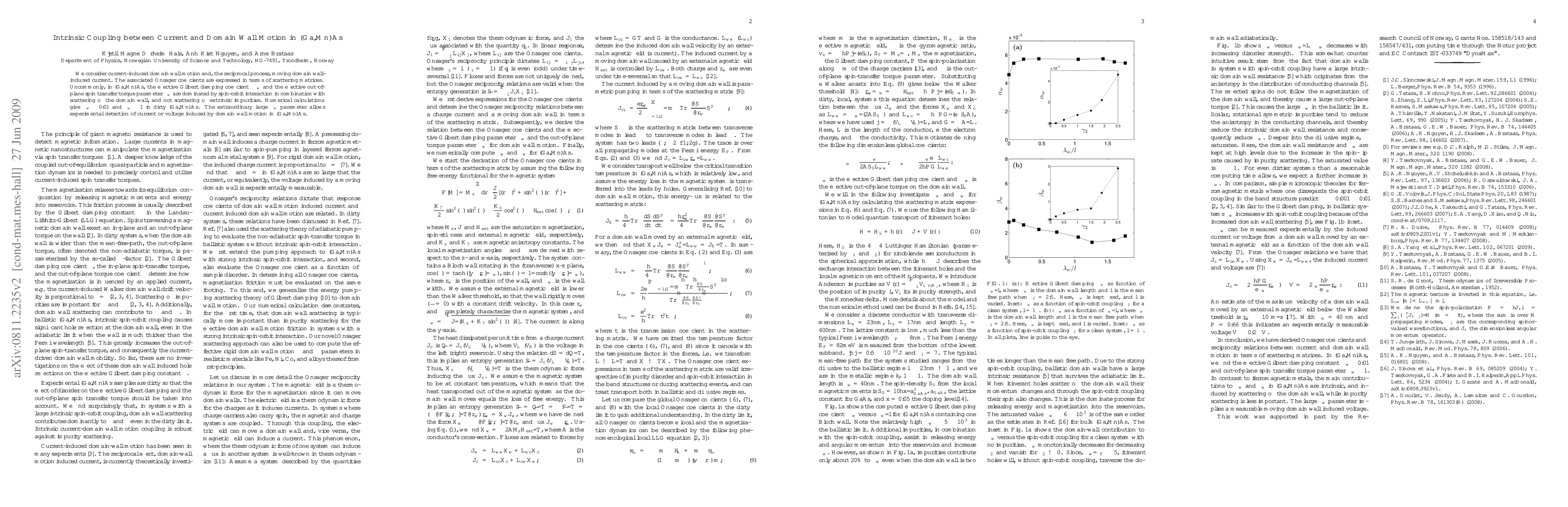 This paper investigates the interplay between current flow and domain wall motion in (Ga,Mn)As, revealing significant spin-orbit interaction effects on effective Gilbert damping and spin transfer torque parameters. Notably, the large out-of-plane spin transfer torque parameter $\beta_w$ enables experimental observation of current induced by domain wall motion.