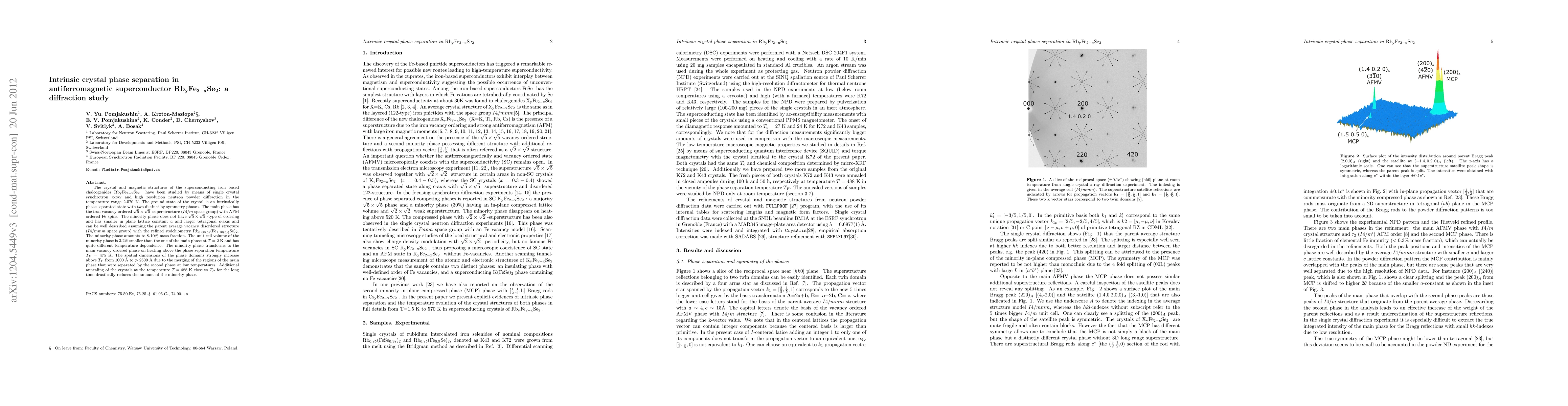 The study uses synchrotron x-ray and neutron diffraction to reveal that RbyFe2-xSe2, an antiferromagnetic superconductor, exhibits intrinsic phase separation at its crystal structure. It consists of a major phase with iron vacancy ordered surd5xsurd5 superstructure and a minor phase, 8-10% by mass, lacking this ordering and described by the parent disordered structure. The minor phase transforms to the major phase upon heating above 475 K, with domain size increasing significantly above this temperature. Prolonged annealing near 488 K can diminish the minor phase.