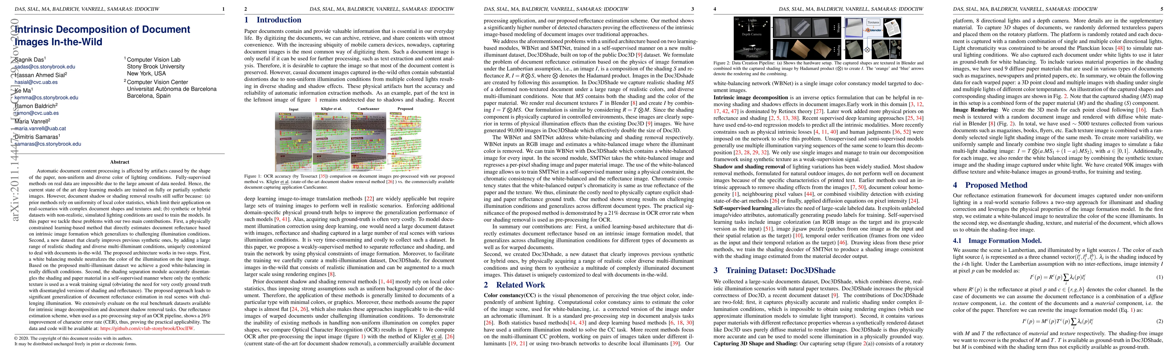 Automatic document content processing is affected by artifacts caused by the shape of the paper, non-uniform and diverse color of lighting conditions. Fully-supervised methods on real data are impossible due to the large amount of data needed. Hence, the current state of the art deep learning models are trained on fully or partially synthetic images. However, document shadow or shading removal results still suffer because: (a) prior methods rely on uniformity of local color statistics, which limit their application on real-scenarios with complex document shapes and textures and; (b) synthetic or hybrid datasets with non-realistic, simulated lighting conditions are used to train the models. In this paper we tackle these problems with our two main contributions. First, a physically constrained learning-based method that directly estimates document reflectance based on intrinsic image formation which generalizes to challenging illumination conditions. Second, a new dataset that clearly improves previous synthetic ones, by adding a large range of realistic shading and diverse multi-illuminant conditions, uniquely customized to deal with documents in-the-wild. The proposed architecture works in a self-supervised manner where only the synthetic texture is used as a weak training signal (obviating the need for very costly ground truth with disentangled versions of shading and reflectance). The proposed approach leads to a significant generalization of document reflectance estimation in real scenes with challenging illumination. We extensively evaluate on the real benchmark datasets available for intrinsic image decomposition and document shadow removal tasks. Our reflectance estimation scheme, when used as a pre-processing step of an OCR pipeline, shows a 26% improvement of character error rate (CER), thus, proving the practical applicability.