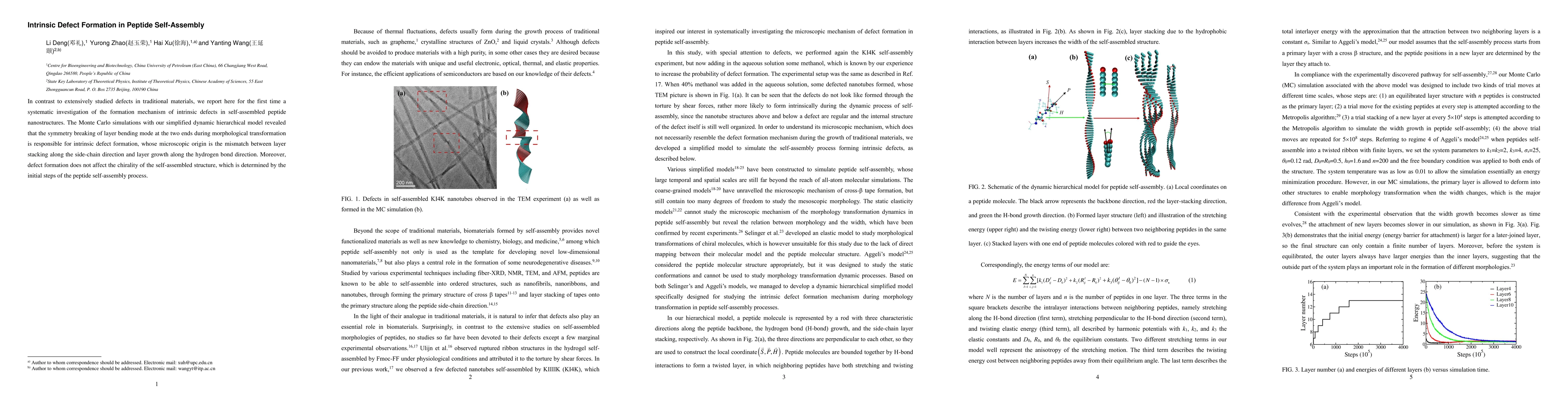 In contrast to extensively studied defects in traditional materials, we report here for the first time a systematic investigation of the formation mechanism of intrinsic defects in self-assembled peptide nanostructures. The Monte Carlo simulations with our simplified dynamic hierarchical model revealed that the symmetry breaking of layer bending mode at the two ends during morphological transformation is responsible for intrinsic defect formation, whose microscopic origin is the mismatch between layer stacking along the side-chain direction and layer growth along the hydrogen bond direction. Moreover, defect formation does not affect the chirality of the self-assembled structure, which is determined by the initial steps of the peptide self-assembly process.