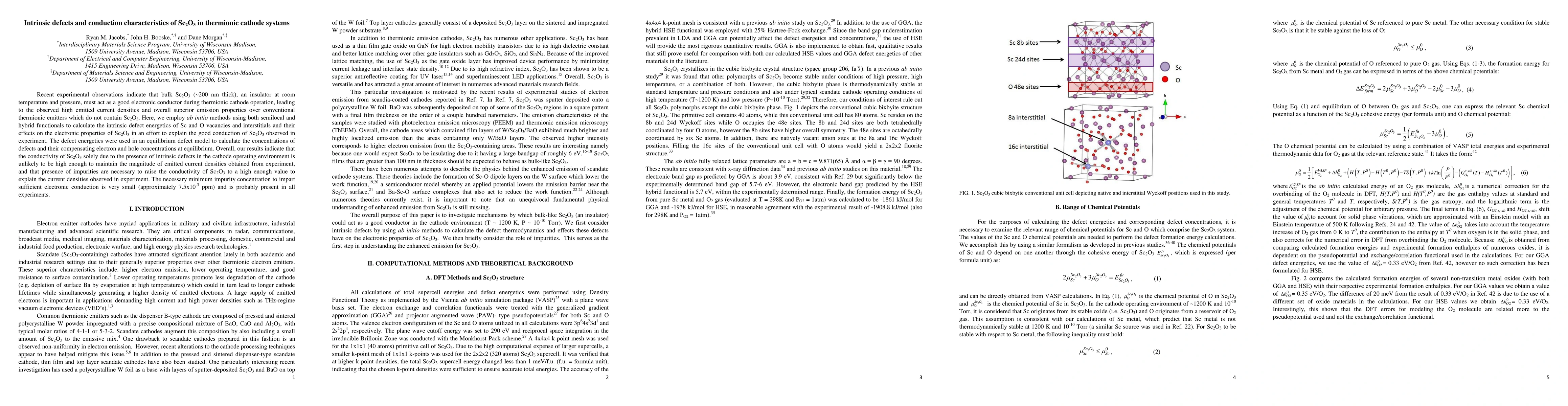 This paper investigates the intrinsic defects in $Sc_2O_3$ and their impact on its electronic conduction in thermionic cathode systems. It concludes that while intrinsic defects can contribute to conductivity, impurities at a very low concentration (approximately $7.5x10^{-3}$ ppm) are necessary to achieve the high current densities observed experimentally.