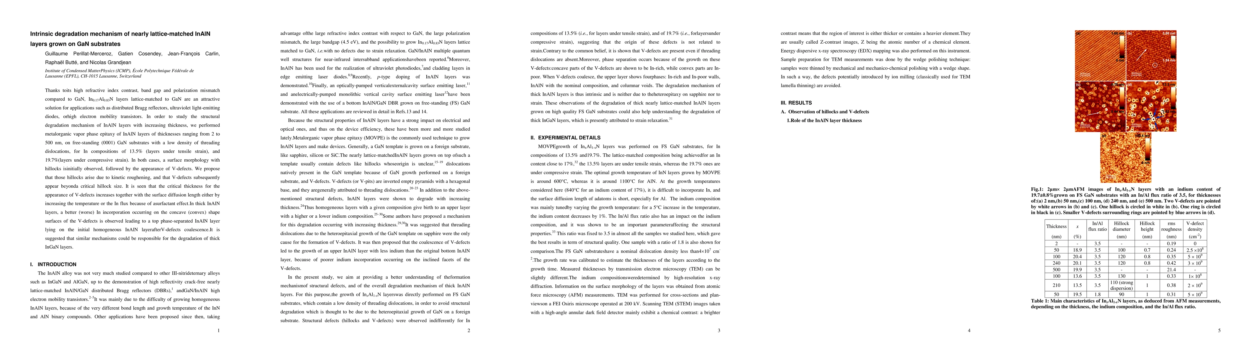 This study investigates the intrinsic degradation mechanism of nearly lattice-matched InAlN layers grown on GaN substrates, revealing that hillocks and V-defects form due to kinetic roughening and surface diffusion, respectively. The critical thickness for V-defects increases with higher temperature or In flux, leading to phase separation in thick layers.