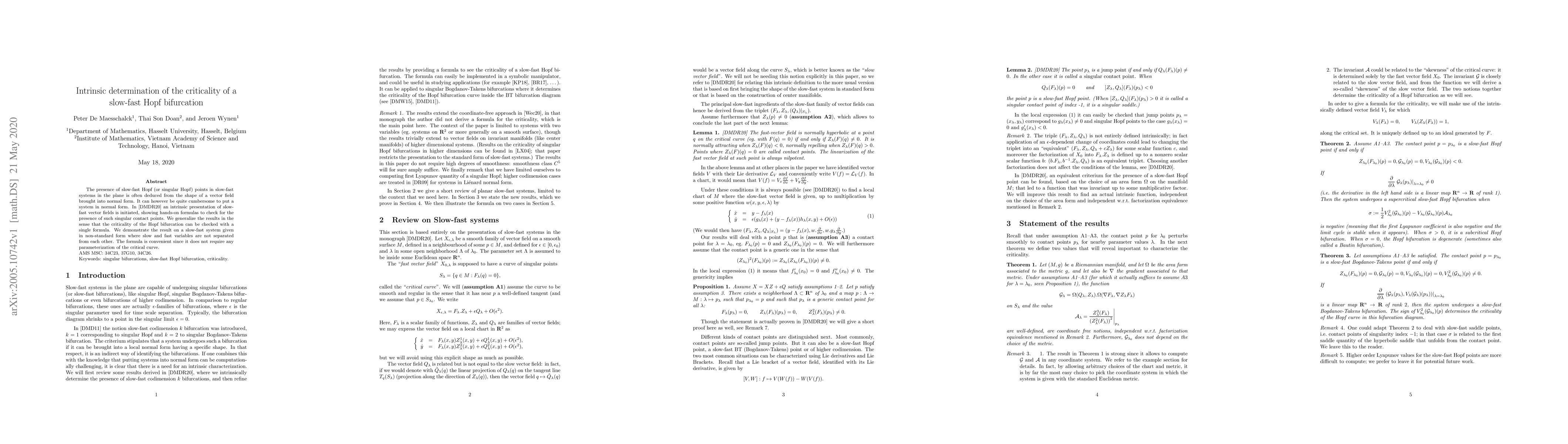 The presence of slow-fast Hopf (or singular Hopf) points in slow-fast systems in the plane is often deduced from the shape of a vector field brought into normal form. It can however be quite cumbersome to put a system in normal form. In the monograph "Canards from birth to transition", an intrinsic presentation of slow-fast vector fields is initiated, showing hands-on formulas to check for the presence of such singular contact points. We generalize the results in the sense that the criticality of the Hopf bifurcation can be checked with a single formula. We demonstrate the result on a slow-fast system given in non-standard form where slow and fast variables are not separated from each other. The formula is convenient since it does not require any parameterization of the critical curve.