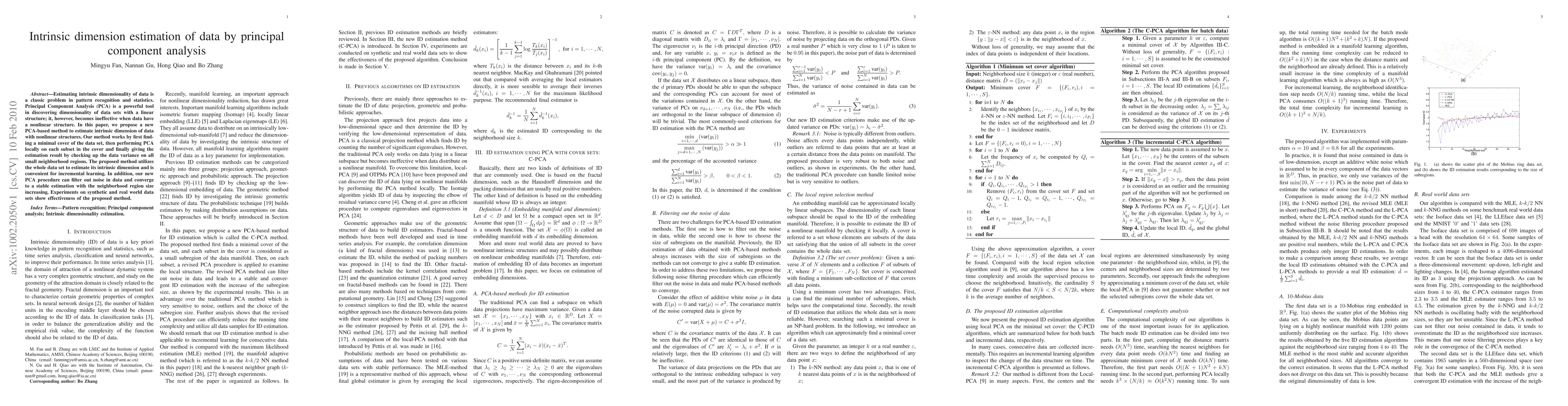 This paper proposes a novel PCA-based method for estimating the intrinsic dimension of data with nonlinear structures, utilizing local PCA on minimal data covers and variance checks across neighborhood regions. The method is effective for incremental learning and noise filtering, as demonstrated by experiments on synthetic and real datasets.