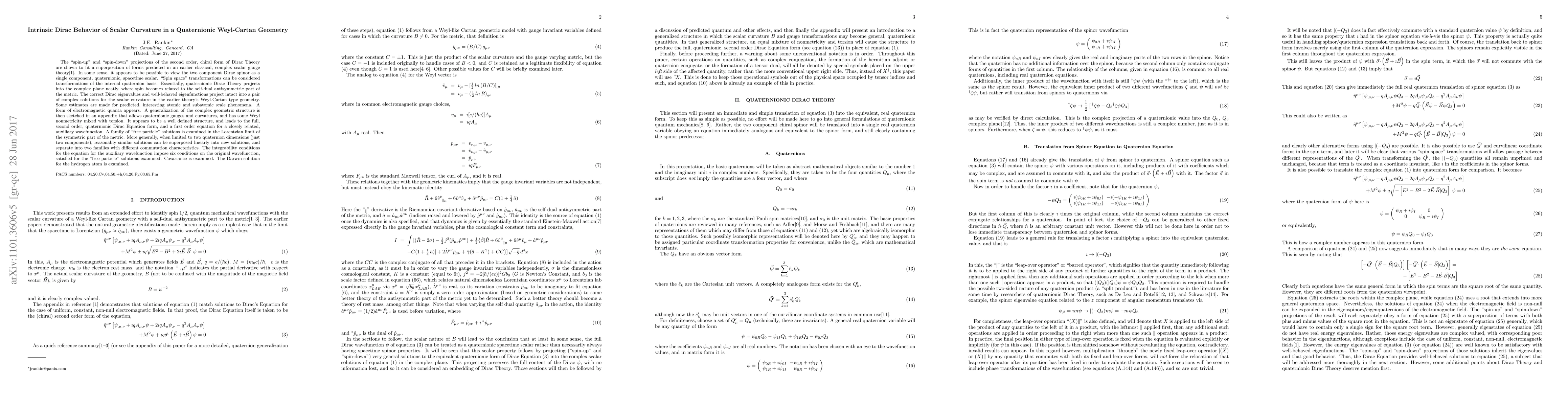 The "spin-up" and "spin-down" projections of the second order, chiral form of Dirac Theory are shown to fit a superposition of forms predicted in an earlier classical, complex scalar gauge theory (April, 1992 Class. Quantum Grav.). In some sense, it appears to be possible to view the two component Dirac spinor as a single component, quaternionic, spacetime scalar. "Spin space" transformations can be considered transformations of the internal quaternion basis. Essentially, quaternionic Dirac Theory projects into the complex plane neatly, where spin becomes related to the self-dual antisymmetric part of the metric. The correct Dirac eigenvalues and well-behaved eigenfunctions project intact into a pair of complex solutions for the scalar curvature in the earlier theory's Weyl-Cartan type geometry. Some estimates are made for predicted, interesting atomic and subatomic scale phenomena. A form of electromagnetic quanta appears. A generalization of the complex geometric structure is then sketched in an appendix that allows quaternionic gauges and curvatures, and has some Weyl nonmetricity mixed with torsion. It appears to be a well defined structure, and leads to the full, second order, quaternionic Dirac Equation form, and a first order equation for a closely related, auxiliary wavefunction. A family of "free particle" solutions is examined in the Lorentzian limit of the symmetric part of the metric. More generally, when limited to two quaternion dimensions (just two components), reasonably similar solutions can be superposed linearly into new solutions, and separate into two families with different commutation characteristics. The integrability conditions for the equation for the auxiliary wavefunction impose six conditions on the original wavefunction, satisfied for the "free particle" solutions examined. Covariance is examined. The Darwin solution for the hydrogen atom is examined.