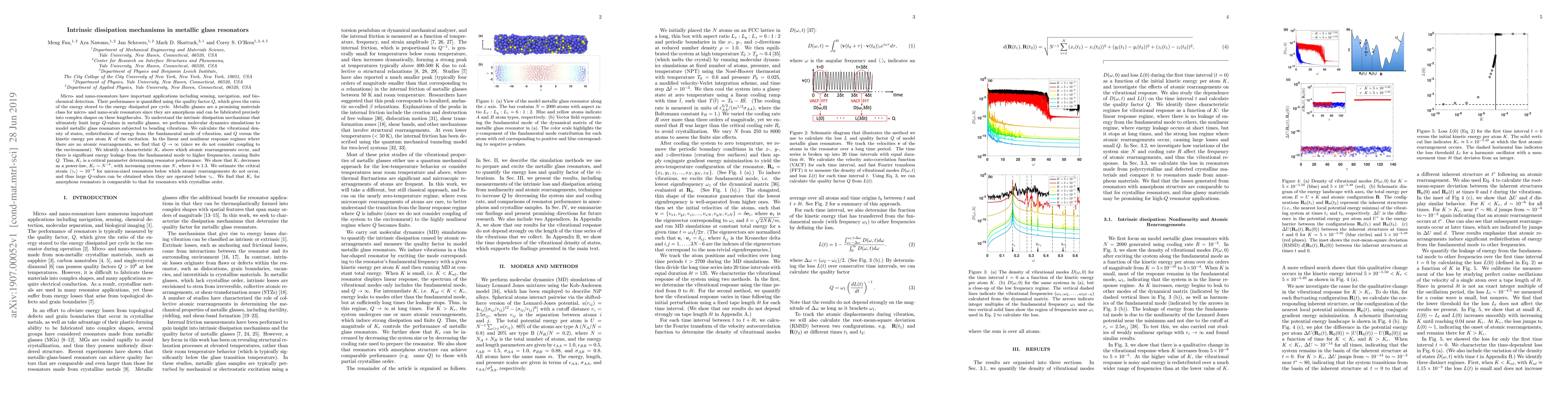 Micro- and nano-resonators have important applications including sensing, navigation, and biochemical detection. Their performance is quantified using the quality factor $Q$, which gives the ratio of the energy stored to the energy dissipated per cycle. Metallic glasses are a promising materials class for micro- and nano-scale resonators since they are amorphous and can be fabricated precisely into complex shapes on these lengthscales. To understand the intrinsic dissipation mechanisms that ultimately limit large $Q$-values in metallic glasses, we perform molecular dynamics simulations to model metallic glass resonators subjected to bending vibrations. We calculate the vibrational density of states, redistribution of energy from the fundamental mode of vibration, and $Q$ versus the kinetic energy per atom $K$ of the excitation. In the linear and nonlinear response regimes where there are no atomic rearrangements, we find that $Q \rightarrow \infty$ (since we do not consider coupling to the environment). We identify a characteristic $K_r$ above which atomic rearrangements occur, and there is significant energy leakage from the fundamental mode to higher frequencies, causing finite $Q$. Thus, $K_r$ is a critical parameter determining resonator performance. We show that $K_r$ decreases as a power-law, $K_r\sim N^{-k},$ with increasing system size $N$, where $k \approx 1.3$. We estimate the critical strain $\langle \gamma_r \rangle \sim 10^{-8}$ for micron-sized resonators below which atomic rearrangements do not occur, and thus large $Q$-values can be obtained when they are operated below $\gamma_r$. We find that $K_r$ for amorphous resonators is comparable to that for resonators with crystalline order.