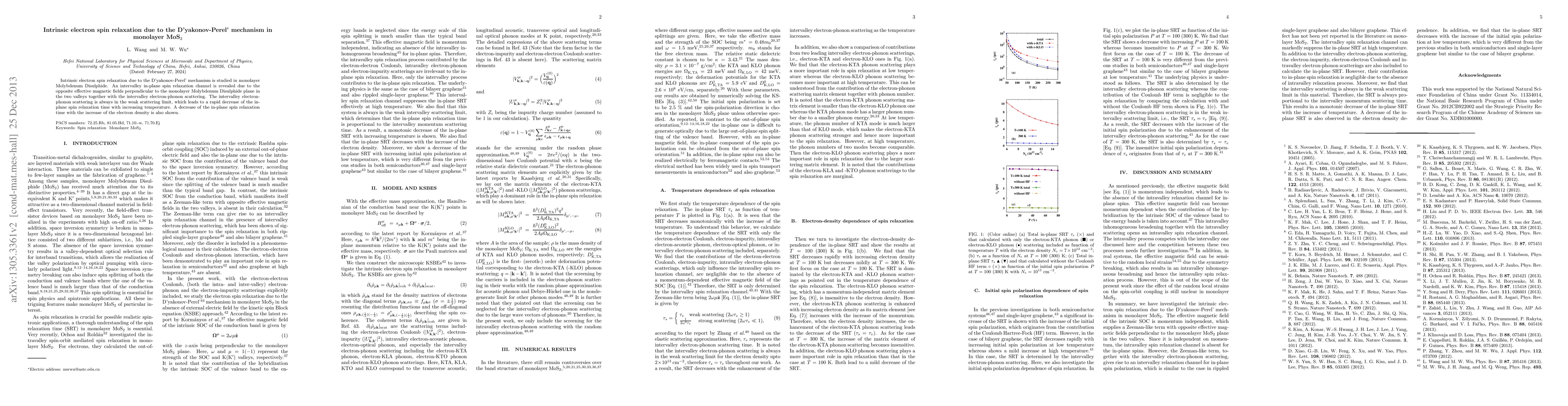 The study investigates intrinsic electron spin relaxation in monolayer MoS$_2$ via the D'yakonov-Perel' mechanism, revealing an intervalley in-plane spin relaxation due to opposing effective magnetic fields in the two valleys and weak intervalley electron-phonon scattering, which causes spin relaxation time to decrease with rising temperature and electron density.