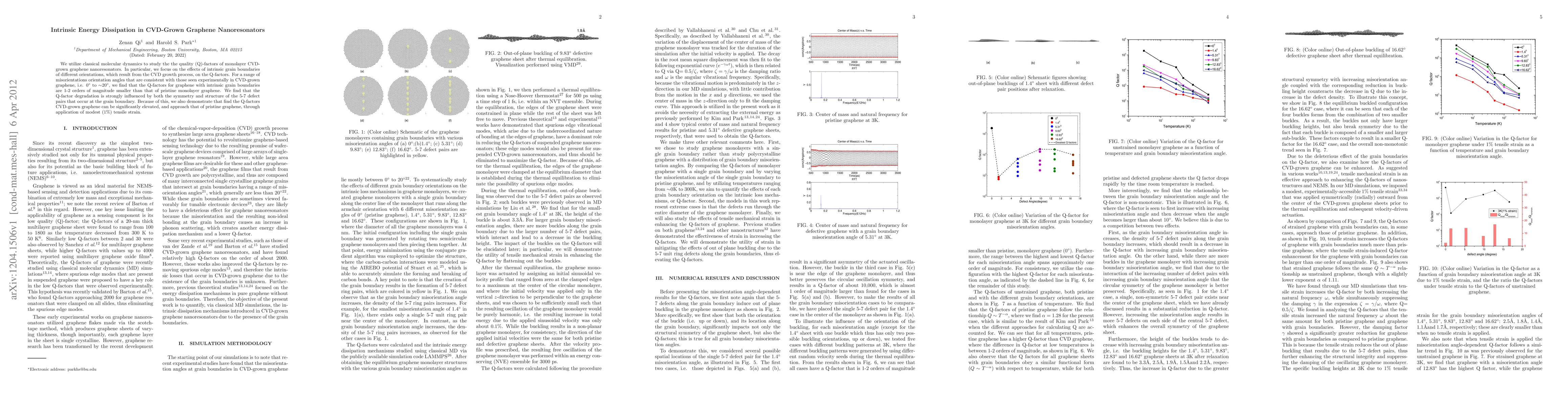 We utilize classical molecular dynamics to study the the quality (Q)-factors of monolayer CVD-grown graphene nanoresonators. In particular, we focus on the effects of intrinsic grain boundaries of different orientations, which result from the CVD growth process, on the Q-factors. For a range of misorientations orientation angles that are consistent with those seen experimentally in CVD-grown graphene, i.e. 0$^{\circ}$ to $\sim20^{\circ}$, we find that the Q-factors for graphene with intrinsic grain boundaries are 1-2 orders of magnitude smaller than that of pristine monolayer graphene. We find that the Q-factor degradation is strongly influenced by both the symmetry and structure of the 5-7 defect pairs that occur at the grain boundary. Because of this, we also demonstrate that find the Q-factors CVD-grown graphene can be significantly elevated, and approach that of pristine graphene, through application of modest (1%) tensile strain.