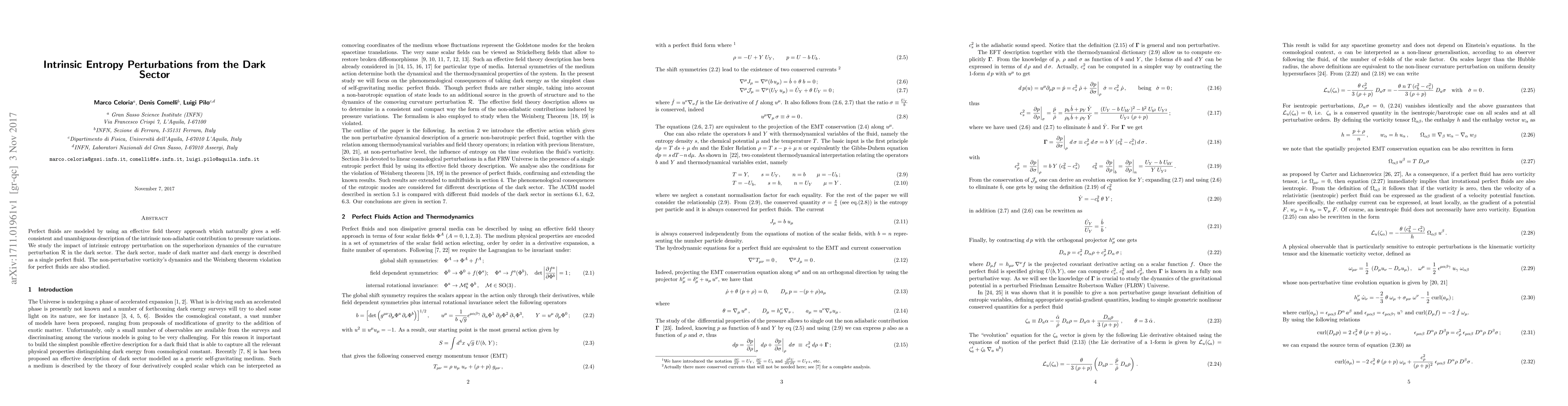 Perfect fluids are modeled by using an effective field theory approach which naturally gives a self-consistent and unambiguous description of the intrinsic non-adiabatic contribution to pressure variations. We study the impact of intrinsic entropy perturbation on the superhorizon dynamics of the curvature perturbation ${\cal R}$ in the dark sector. The dark sector, made of dark matter and dark energy is described as a single perfect fluid. The non-perturbative vorticity's dynamics and the Weinberg theorem violation for perfect fluids are also studied.