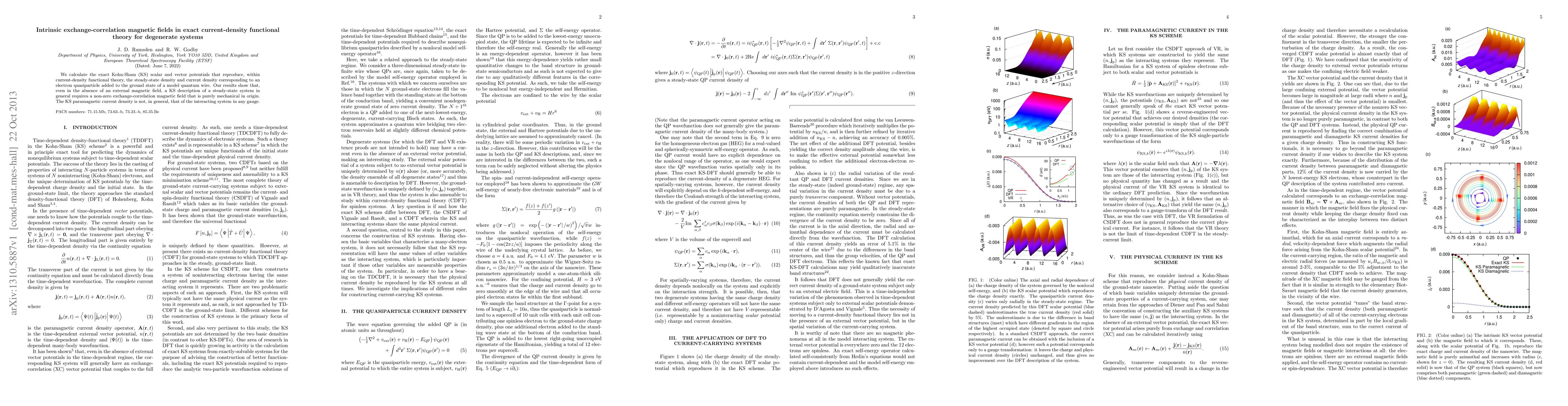 This paper calculates exact Kohn-Sham scalar and vector potentials in current-density functional theory, revealing intrinsic exchange-correlation magnetic fields in degenerate systems. Even without external fields, the Kohn-Sham description necessitates a non-zero mechanical magnetic field, differing from the interacting system's gauge-dependent current density.