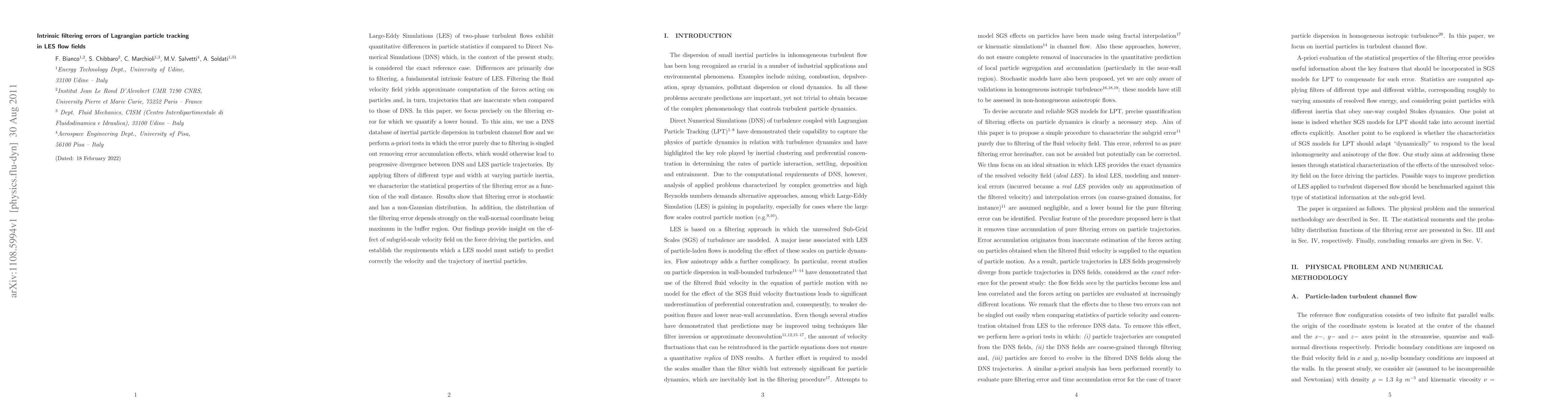 This paper quantifies the intrinsic filtering errors in Lagrangian particle tracking within Large-Eddy Simulations (LES) of turbulent flows, comparing them to Direct Numerical Simulations (DNS). The study reveals that filtering errors are stochastic and non-Gaussian, with maximum error in the buffer region near walls, providing insights into subgrid-scale effects on particle forces and trajectory predictions.