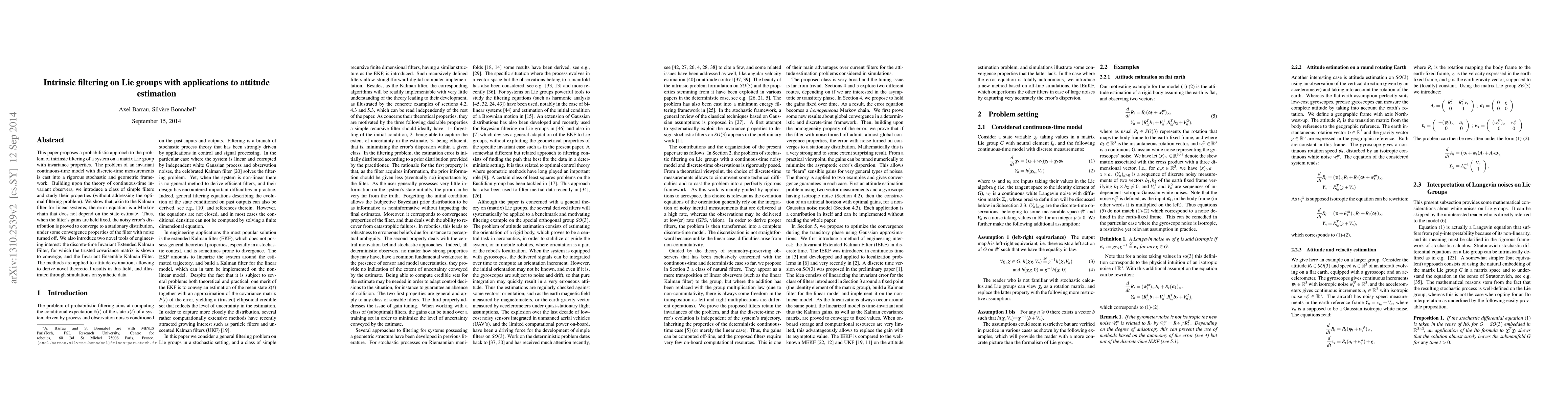 This paper proposes a probabilistic approach to intrinsic filtering on matrix Lie groups with applications to attitude estimation, showing that the error equation is a Markov chain that converges to a stationary distribution.