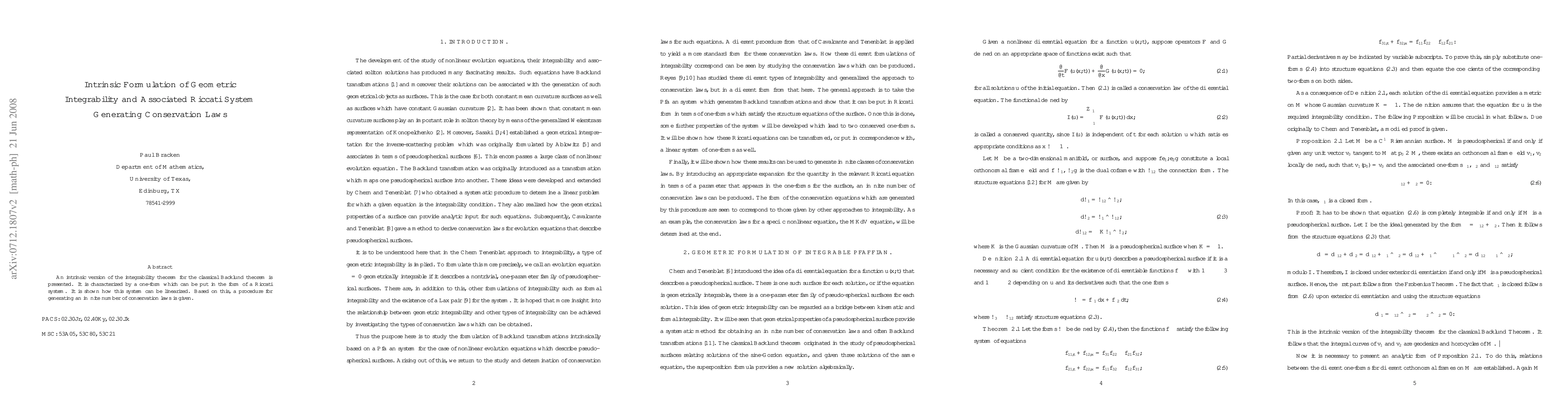 An intrinsic version of the integrability theorem for the classical Backlund theorem is presented. It is characterized by a one-form which can be put in the form of a Riccati system. It is shown how this system can be linearized. Based on this, a procedure for generating an infinite number of conservation laws is given.