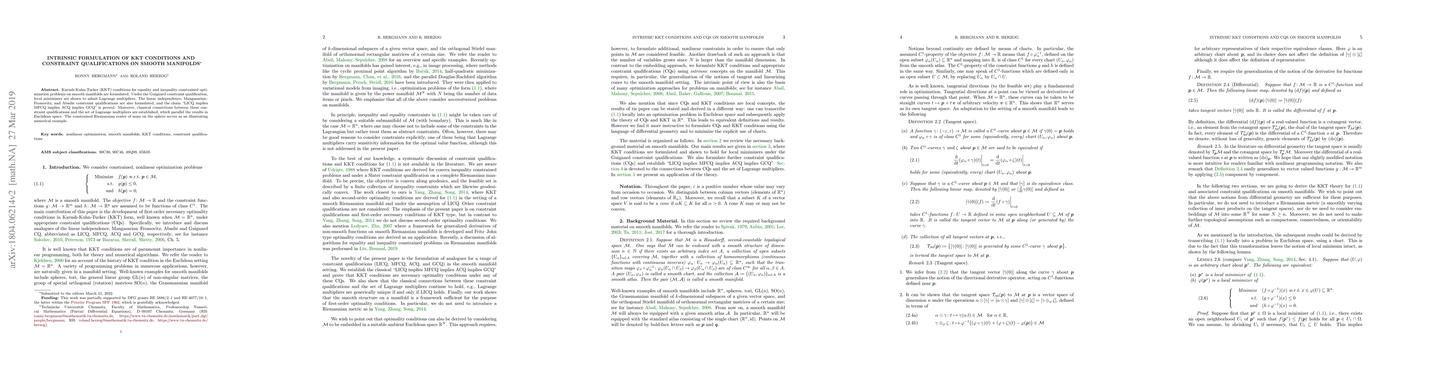 This paper formulates the Karush-Kuhn-Tucker (KKT) conditions for optimization problems on smooth manifolds and establishes constraint qualifications analogous to those in Euclidean space. It proves the chain "LICQ implies MFCQ implies ACQ implies GCQ" and illustrates the theory with a numerical example of constrained Riemannian center of mass on the sphere.