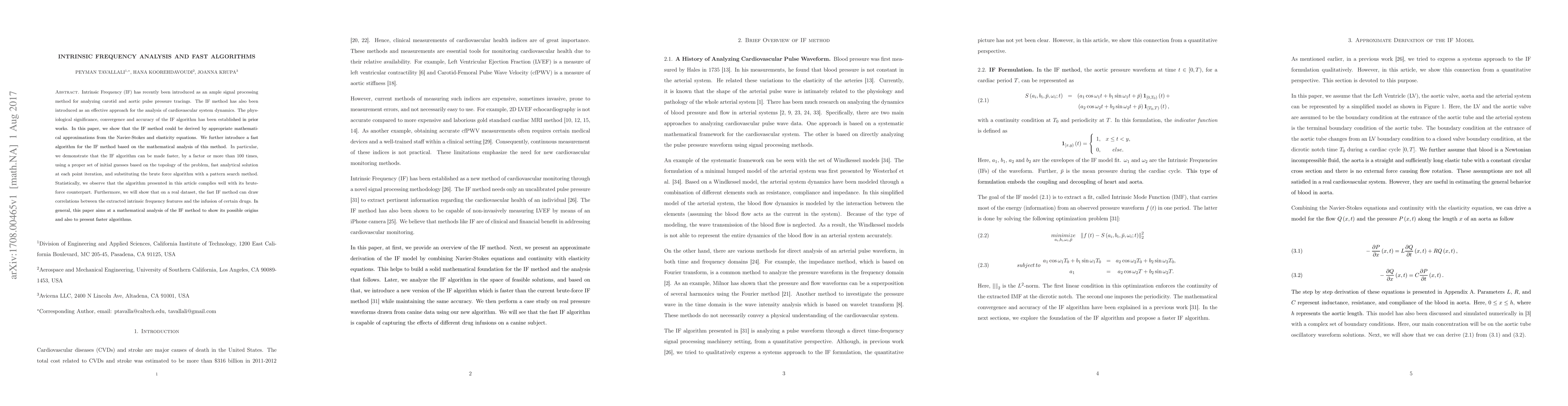 Intrinsic Frequency (IF) has recently been introduced as an ample signal processing method for analyzing carotid and aortic pulse pressure tracings. The IF method has also been introduced as an effective approach for the analysis of cardiovascular system dynamics. The physiological significance, convergence and accuracy of the IF algorithm has been established in prior works. In this paper, we show that the IF method could be derived by appropriate mathematical approximations from the Navier-Stokes and elasticity equations. We further introduce a fast algorithm for the IF method based on the mathematical analysis of this method. In particular, we demonstrate that the IF algorithm can be made faster, by a factor or more than 100 times, using a proper set of initial guesses based on the topology of the problem, fast analytical solution at each point iteration, and substituting the brute force algorithm with a pattern search method. Statistically, we observe that the algorithm presented in this article complies well with its brute-force counterpart. Furthermore, we will show that on a real dataset, the fast IF method can draw correlations between the extracted intrinsic frequency features and the infusion of certain drugs. In general, this paper aims at a mathematical analysis of the IF method to show its possible origins and also to present faster algorithms.