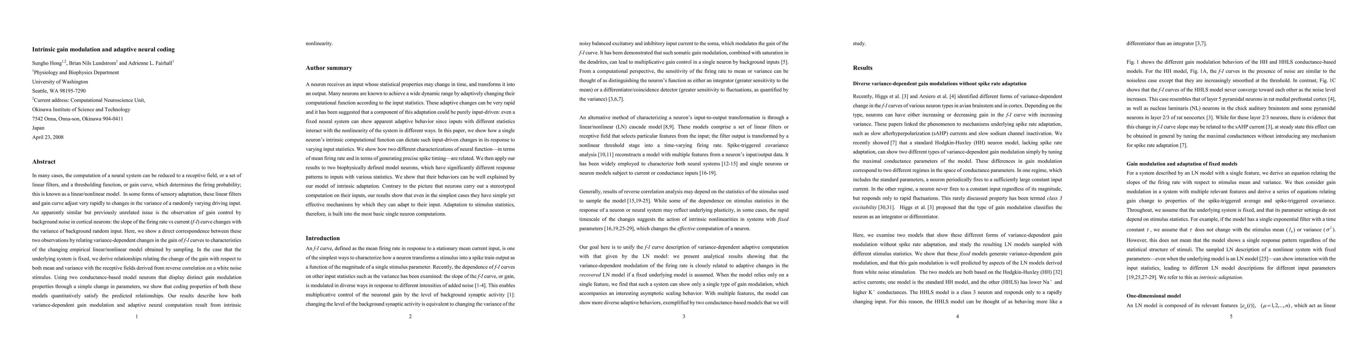 This paper explores the relationship between intrinsic gain modulation and adaptive neural coding, showing how variance-dependent changes in gain curves correspond to adjustments in linear filters and thresholding functions in neural systems. It demonstrates that both gain modulation and adaptive computation arise from intrinsic nonlinearity, supported by conductance-based model neurons.