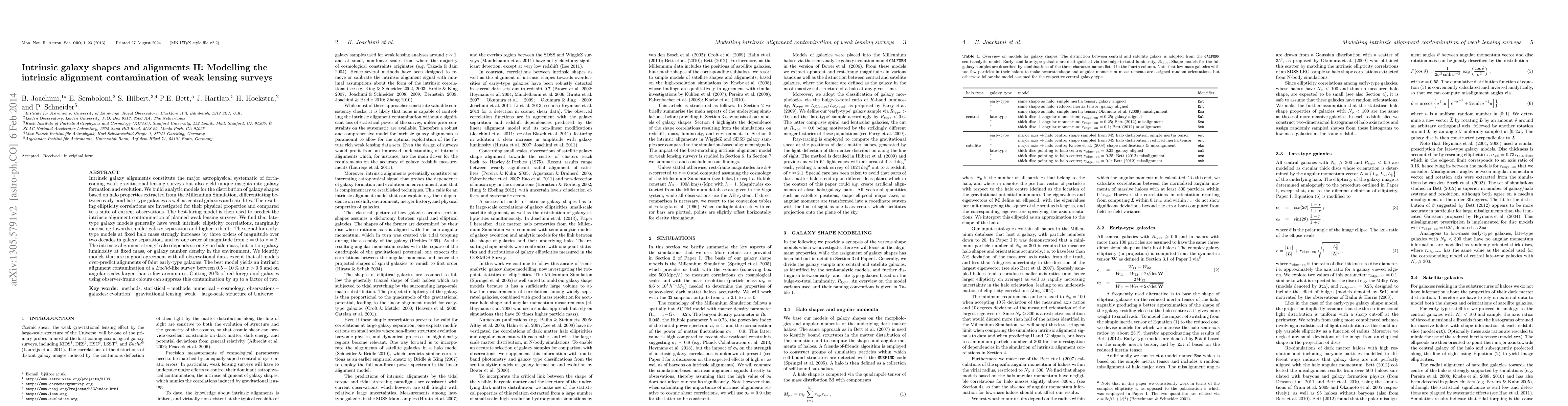 This paper develops analytic models to quantify intrinsic galaxy alignments, which are a major systematic for weak lensing surveys, using data from the Millennium Simulation. It finds that early-type galaxies exhibit strong intrinsic alignments, while late-type galaxies show weaker effects, and predicts that intrinsic alignments will contribute 0.5-10% contamination to a Euclid-like survey at z>0.6, which can be reduced by removing 20% of red foreground galaxies.