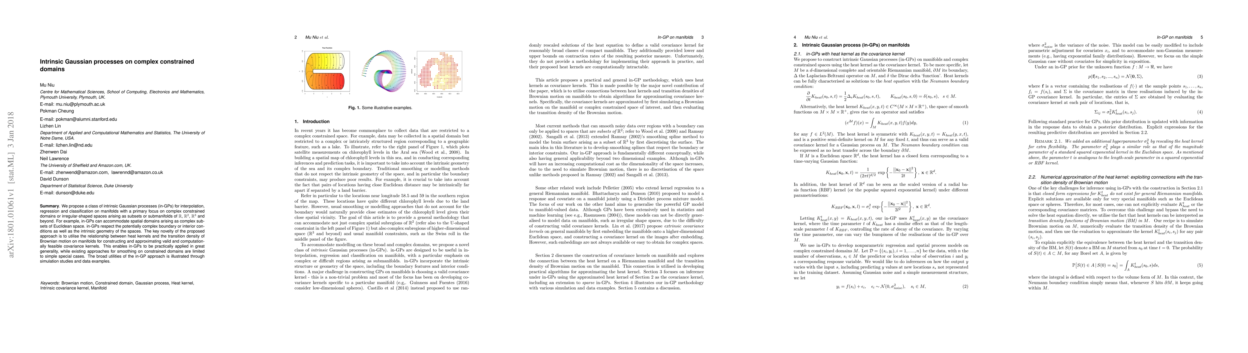 This paper introduces intrinsic Gaussian processes (in-GPs) for interpolation, regression, and classification on complex constrained domains, leveraging the relationship between heat kernels and Brownian motion to construct valid and computationally feasible covariance kernels. The approach is demonstrated to be broadly applicable through simulations and data examples.