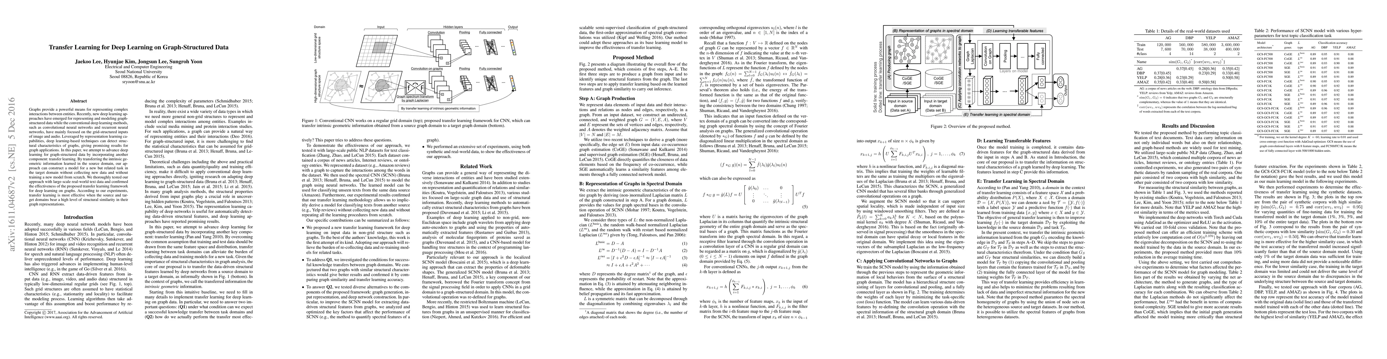 Graphs provide a powerful means for representing complex interactions between entities. Recently, deep learning approaches are emerging for representing and modeling graph-structured data, although the conventional deep learning methods (such as convolutional neural networks and recurrent neural networks) have mainly focused on grid-structured inputs (image and audio). Leveraged by the capability of representation learning, deep learning based techniques are reporting promising results for graph applications by detecting structural characteristics of graphs in an automated fashion. In this paper, we attempt to advance deep learning for graph-structured data by incorporating another component, transfer learning. By transferring the intrinsic geometric information learned in the source domain, our approach can help us to construct a model for a new but related task in the target domain without collecting new data and without training a new model from scratch. We thoroughly test our approach with large-scale real corpora and confirm the effectiveness of the proposed transfer learning framework for deep learning on graphs. According to our experiments, transfer learning is most effective when the source and target domains bear a high level of structural similarity in their graph representations.