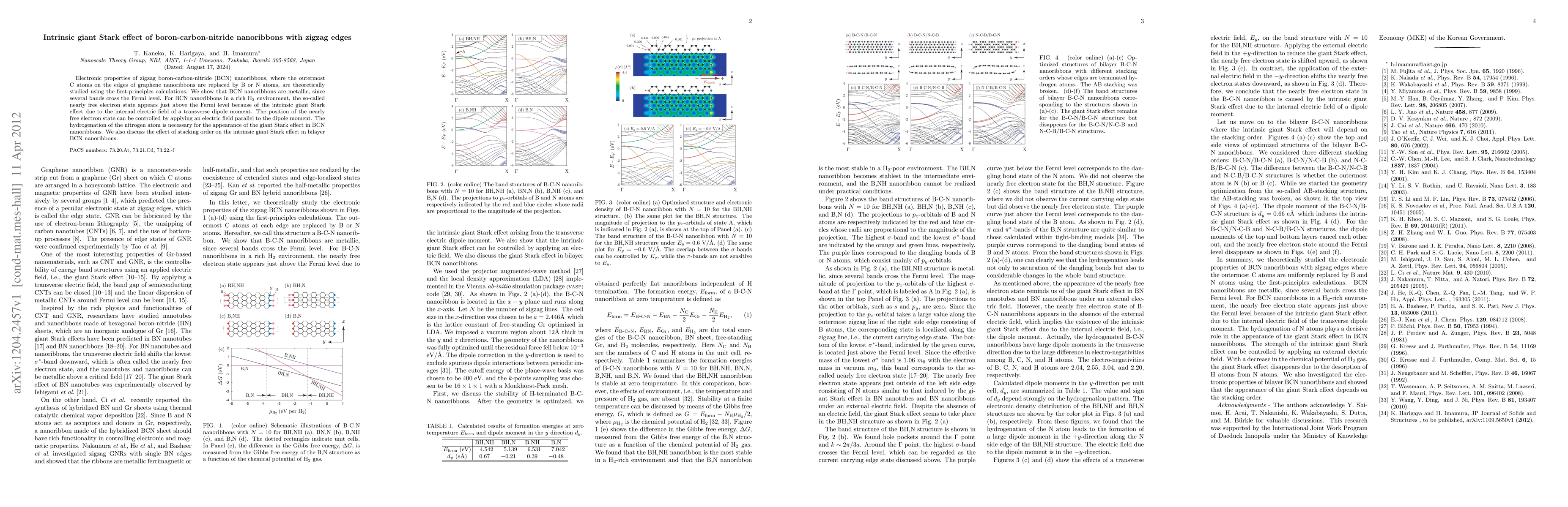 Summary: First-principles calculations reveal that zigzag boron-carbon-nitride nanoribbons exhibit metallic behavior, and hydrogenation of nitrogen atoms induces an intrinsic giant Stark effect, leading to a nearly free electron state controllable by parallel electric fields. The stacking order influences this effect in bilayer nanoribbons.