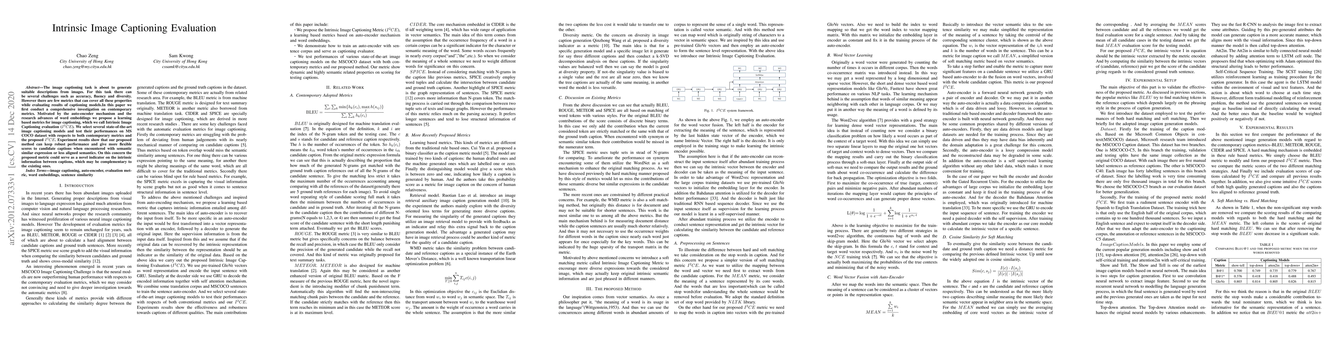 The image captioning task is about to generate suitable descriptions from images. For this task there can be several challenges such as accuracy, fluency and diversity. However there are few metrics that can cover all these properties while evaluating results of captioning models.In this paper we first conduct a comprehensive investigation on contemporary metrics. Motivated by the auto-encoder mechanism and the research advances of word embeddings we propose a learning based metrics for image captioning, which we call Intrinsic Image Captioning Evaluation(I2CE). We select several state-of-the-art image captioning models and test their performances on MS COCO dataset with respects to both contemporary metrics and the proposed I2CE. Experiment results show that our proposed method can keep robust performance and give more flexible scores to candidate captions when encountered with semantic similar expression or less aligned semantics. On this concern the proposed metric could serve as a novel indicator on the intrinsic information between captions, which may be complementary to the existing ones.