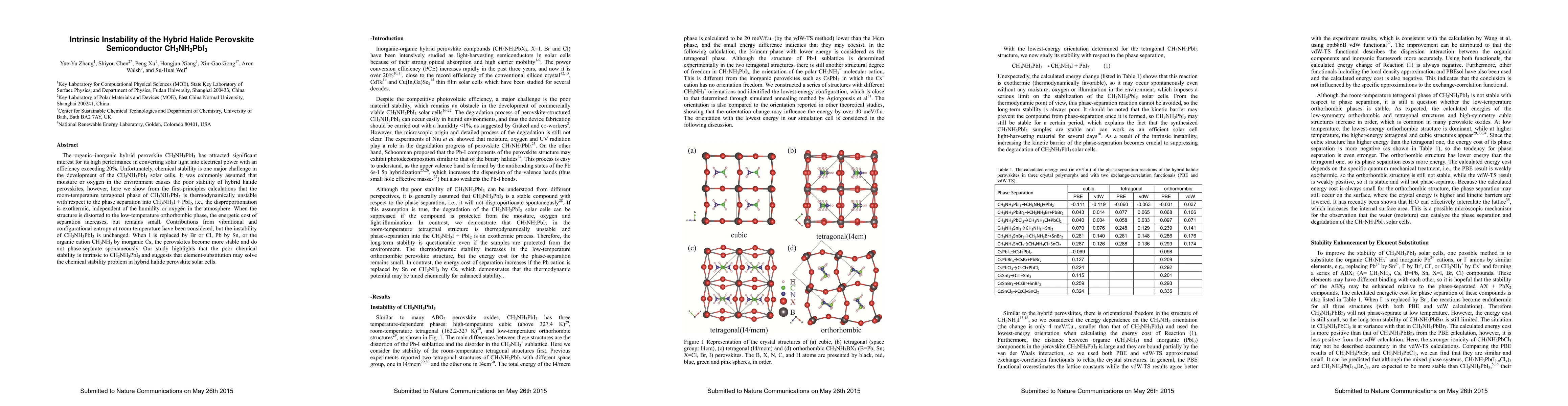 This paper reveals that the intrinsic instability of the hybrid halide perovskite CH3NH3PbI3 is due to its thermodynamically unfavorable tetragonal phase, which spontaneously decomposes into CH3NH3I and PbI2, independent of environmental factors. Element substitutions, such as replacing I with Br or Cl, Pb with Sn, or CH3NH3 with Cs, enhance stability, suggesting these changes as potential solutions for the stability issue in perovskite solar cells.