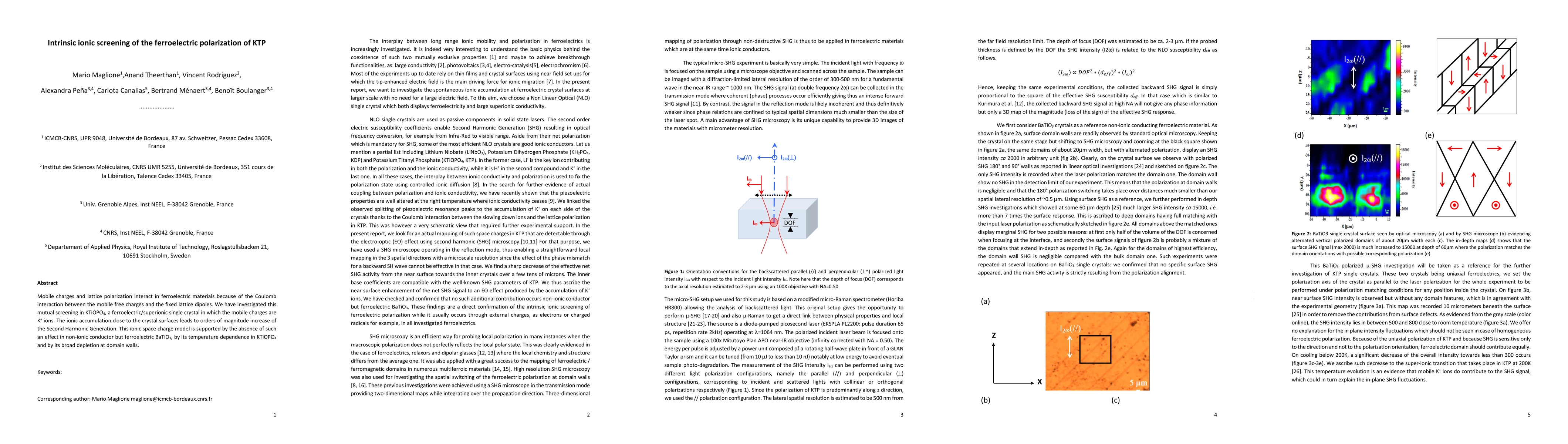 This study investigates the intrinsic ionic screening of ferroelectric polarization in KTiOPO4, revealing that mobile K+ ions significantly enhance Second Harmonic Generation due to ionic space charge effects, unlike in non-ionic ferroelectric BaTiO3. The findings are supported by temperature dependence and domain wall observations.