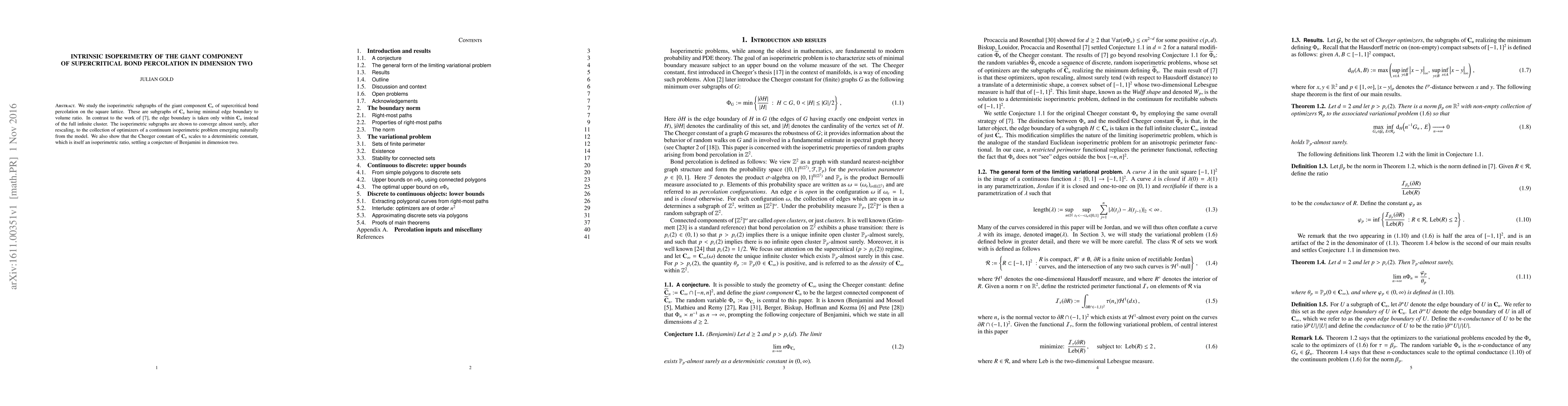 This paper investigates the isoperimetric subgraphs within the giant component of supercritical bond percolation on a square lattice. It shows that these subgraphs converge to solutions of a continuum isoperimetric problem and that the Cheeger constant scales to a deterministic constant, resolving a conjecture by Benjamini.