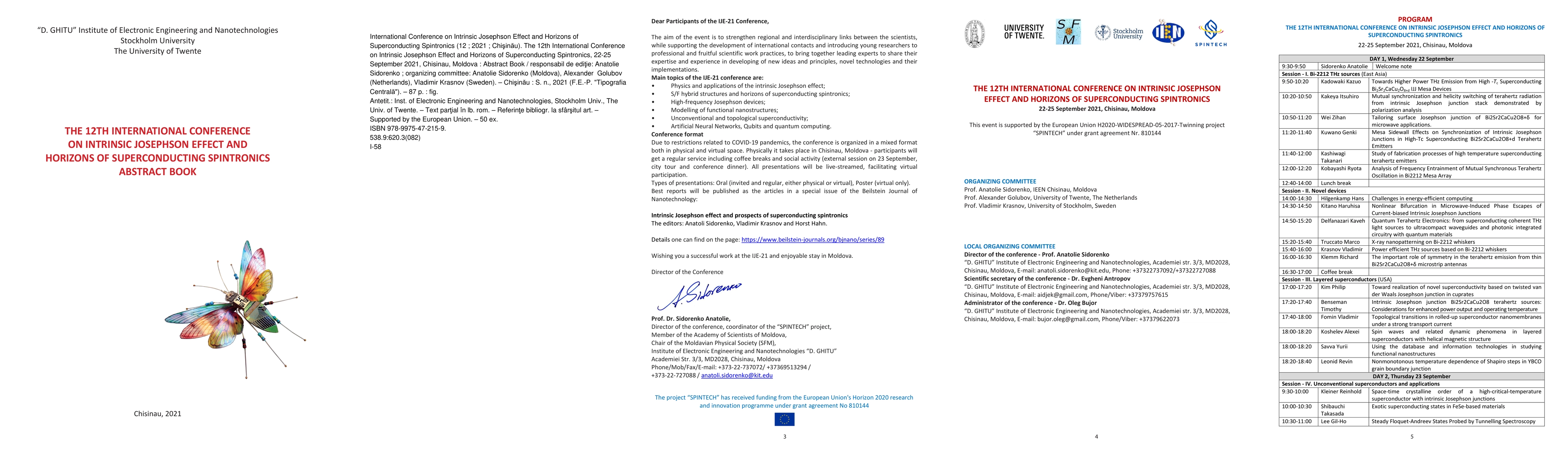 International Conference on Intrinsic Josephson Effect and Horizons of Superconducting Spintronics. The 12th International Conference on Intrinsic Josephson Effect and Horizons of Superconducting Spintronics, 22-25 September 2021, Chisinau, Moldova; Abstract Book, The editor Anatolie Sidorenko ; organizing committee Anatolie Sidorenko, Moldova; Alexander Golubov,Netherlands; Vladimir Krasnov,Sweden. Chisinau, 2021 F.E.-P. Tipografia Central. 87 p.