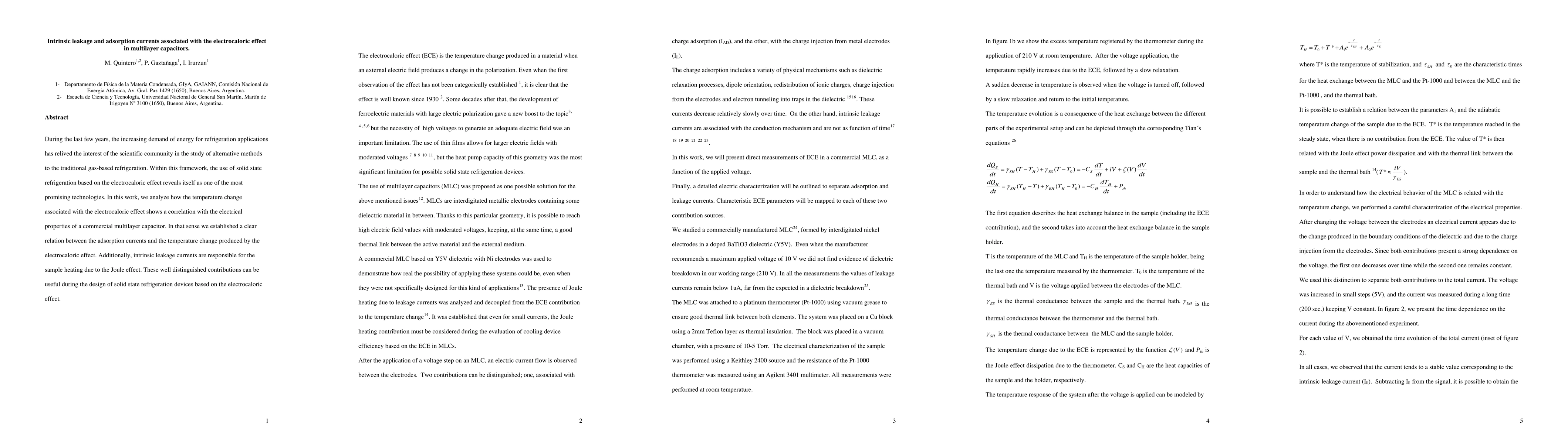 This paper investigates the electrocaloric effect in multilayer capacitors, correlating the temperature change with electrical properties and identifying intrinsic leakage and adsorption currents. These findings are crucial for designing solid-state refrigeration devices based on the electrocaloric effect.