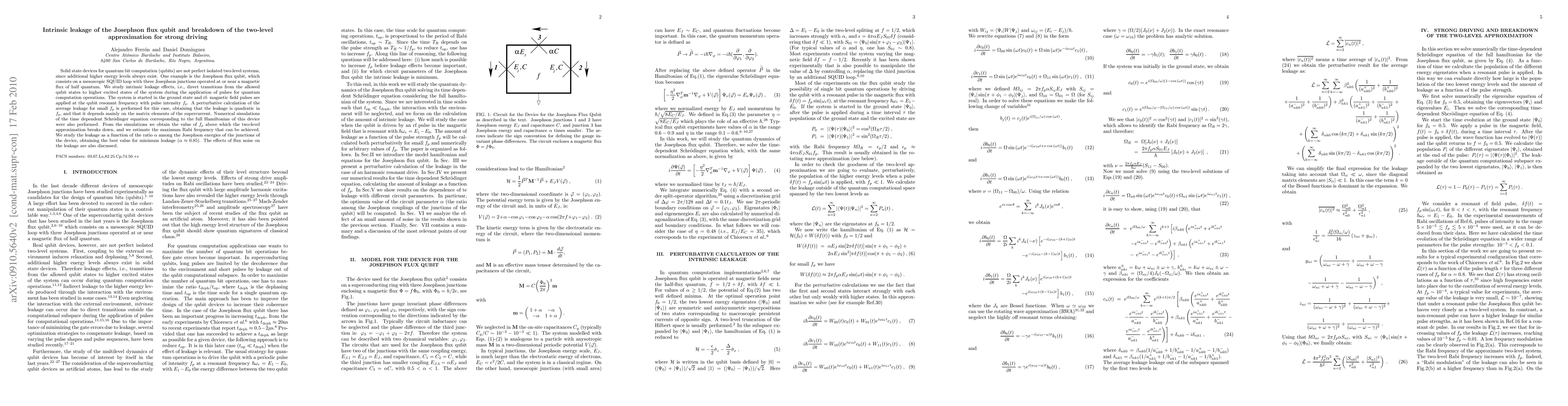Researchers studied the Josephson flux qubit, finding that strong driving pulses cause quadratic leakage into higher energy states, which breaks down the two-level approximation. They found optimal conditions for minimal leakage and discussed the impact of flux noise.