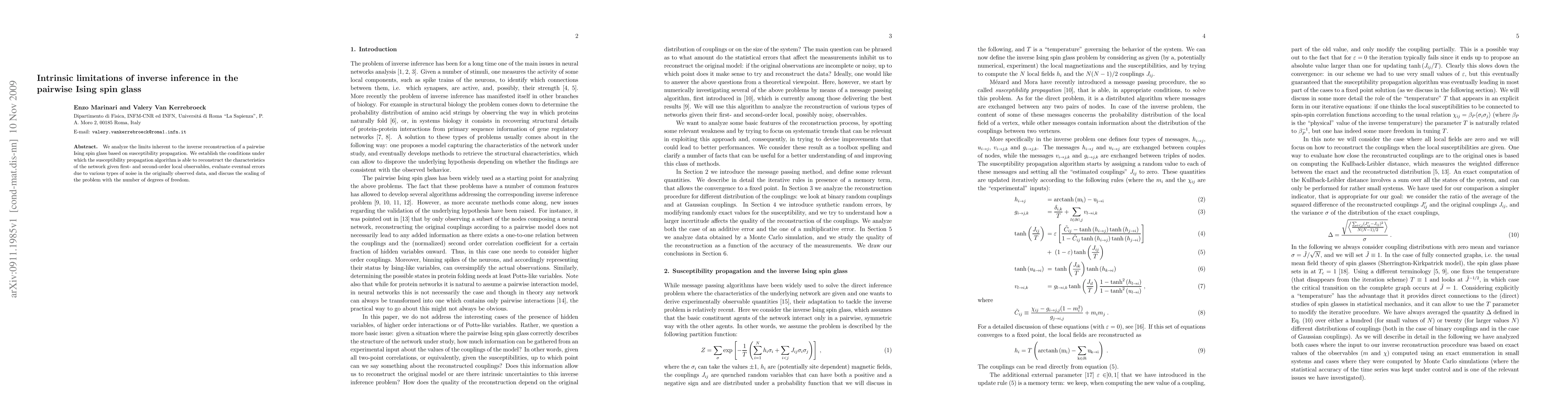 This paper investigates the intrinsic limitations of reconstructing a pairwise Ising spin glass using susceptibility propagation, identifying conditions for successful reconstruction and analyzing errors due to noise, while also considering the problem's scaling with network size.