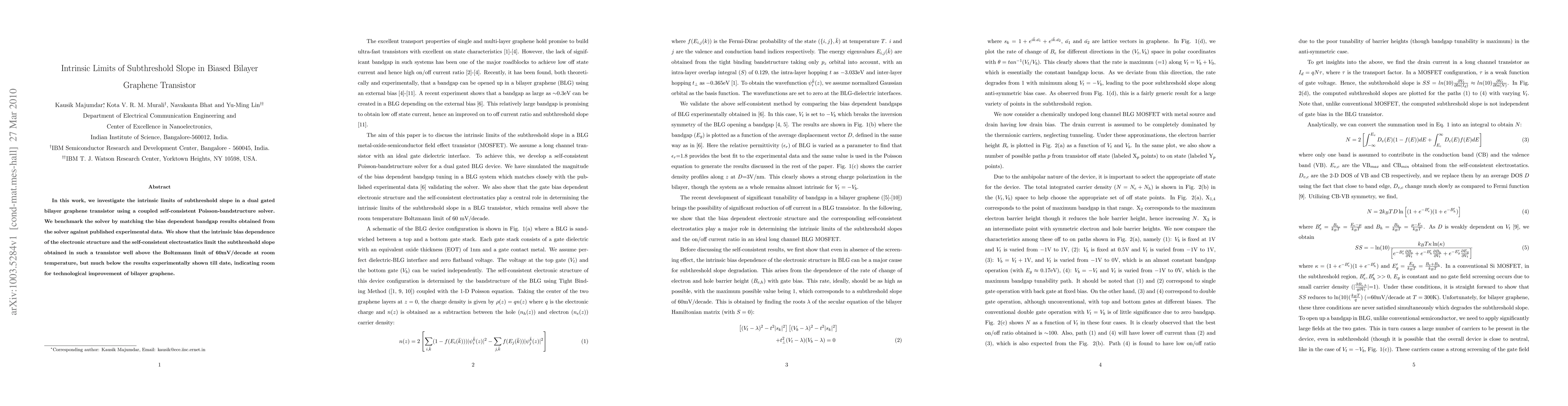 This research is important because it investigates the intrinsic limits of subthreshold slope in dual gated bilayer graphene transistor and provides a basis for future improvements.
