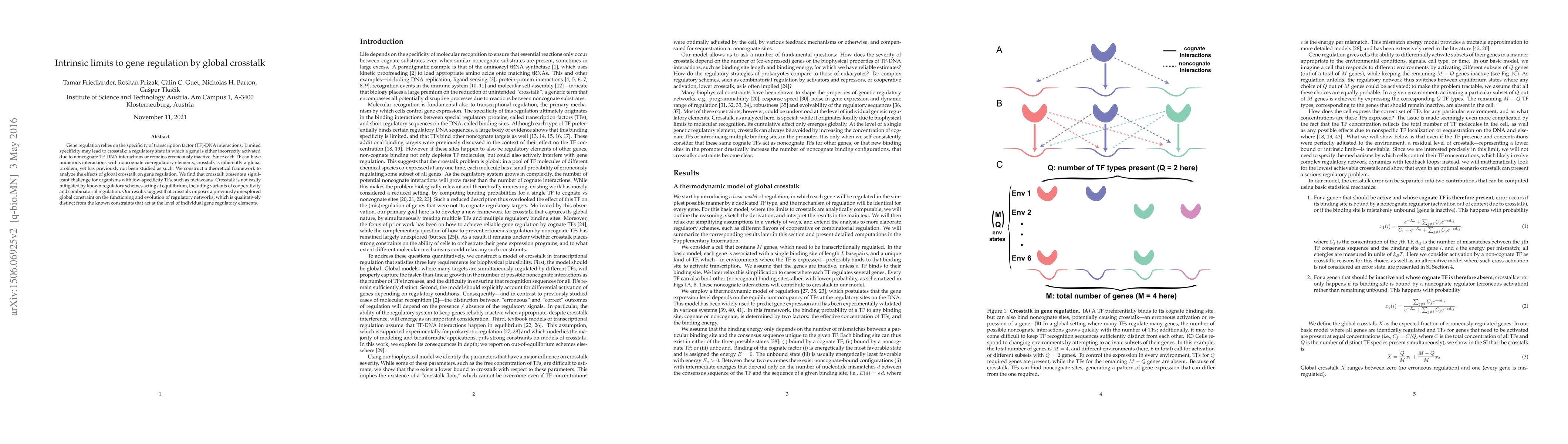 Gene regulation relies on the specificity of transcription factor (TF) - DNA interactions. In equilibrium, limited specificity may lead to crosstalk: a regulatory state in which a gene is either incorrectly activated due to noncognate TF-DNA interactions or remains erroneously inactive. We present a tractable biophysical model of global crosstalk, where many genes are simultaneously regulated by many TFs. We show that in the simplest regulatory scenario, a lower bound on crosstalk severity can be analytically derived solely from the number of (co)regulated genes and a suitable parameter that describes binding site similarity. Estimates show that crosstalk could present a significant challenge for organisms with low-specificity TFs, such as metazoans, unless they use appropriate regulation schemes. Strong cooperativity substantially decreases crosstalk, while joint regulation by activators and repressors, surprisingly, does not; moreover, certain microscopic details about promoter architecture emerge as globally important determinants of crosstalk strength. Our results suggest that crosstalk imposes a new type of global constraint on the functioning and evolution of regulatory networks, which is qualitatively distinct from the known constraints acting at the level of individual gene regulatory elements.