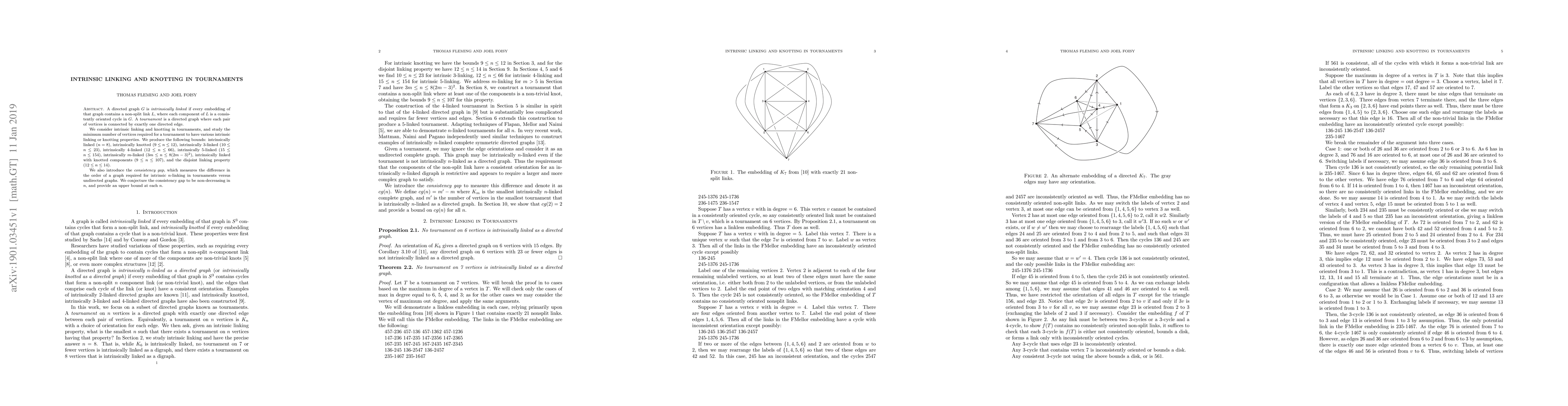 This paper investigates intrinsic linking and knotting properties in tournaments, determining the minimum number of vertices required for various intrinsic linking and knotting configurations. It establishes bounds for intrinsically linked, knotted, and $m$-linked tournaments, and introduces the consistency gap to compare these requirements in tournaments versus undirected graphs.