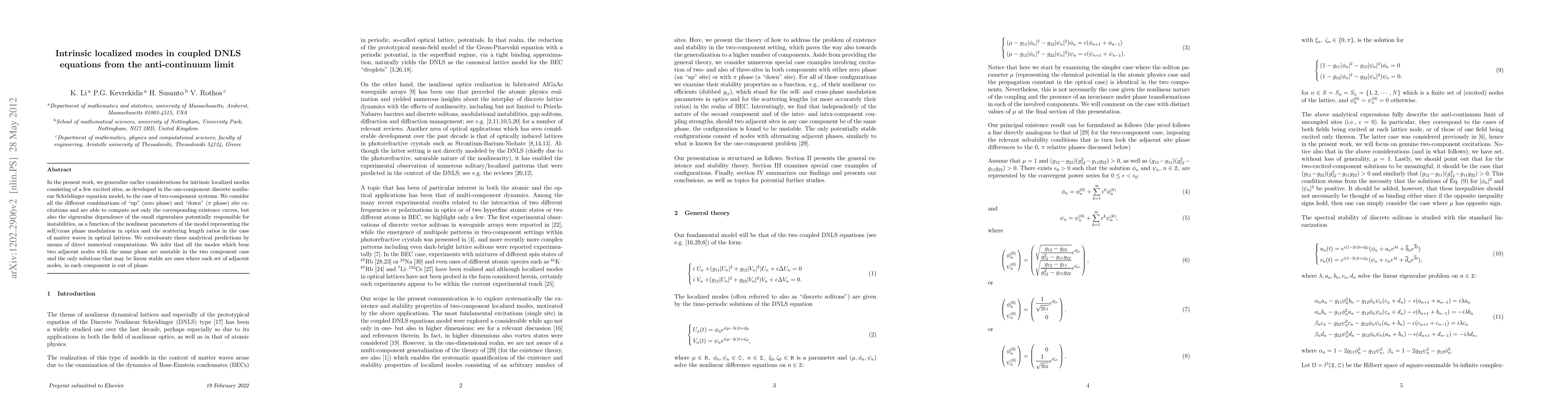 In the present work, we generalize earlier considerations for intrinsic localized modes consisting of a few excited sites, as developed in the one-component discrete nonlinear Schrodinger equation model, to the case of two-component systems. We consider all the different combinations of "up" (zero phase) and "down" ({\pi} phase) site excitations and are able to compute not only the corresponding existence curves, but also the eigenvalue dependences of the small eigenvalues potentially responsible for instabilities, as a function of the nonlinear parameters of the model representing the self/cross phase modulation in optics and the scattering length ratios in the case of matter waves in optical lattices. We corroborate these analytical predictions by means of direct numerical computations. We infer that all the modes which bear two adjacent nodes with the same phase are unstable in the two component case and the only solutions that may be linear stable are ones where each set of adjacent nodes, in each component is out of phase.