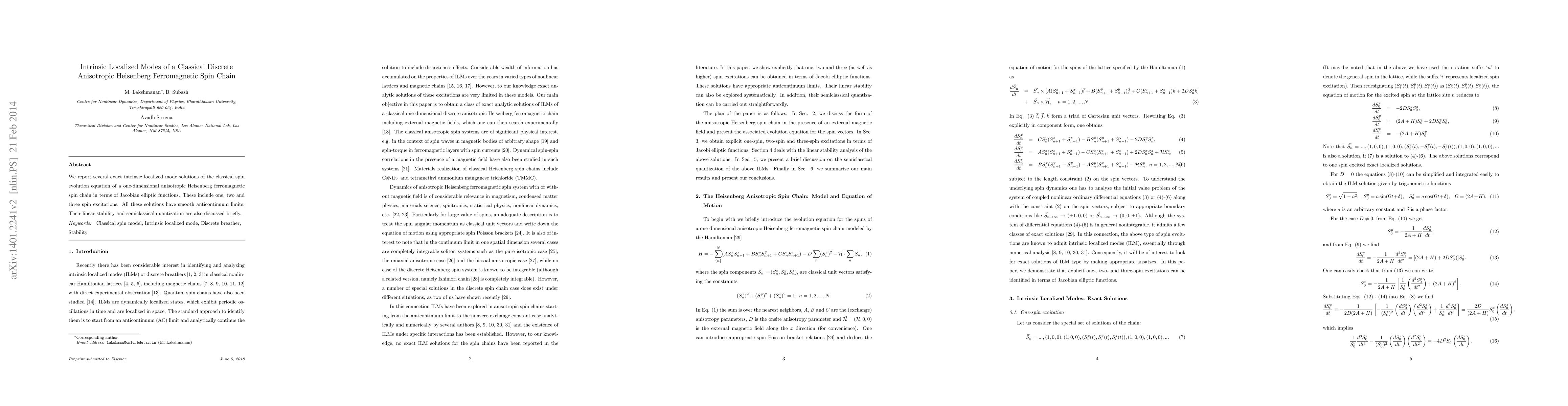 This paper presents exact intrinsic localized mode solutions for a one-dimensional anisotropic Heisenberg ferromagnetic spin chain, expressed in terms of Jacobian elliptic functions, including single, double, and triple spin excitations. The study also briefly examines their linear stability and semiclassical quantization.